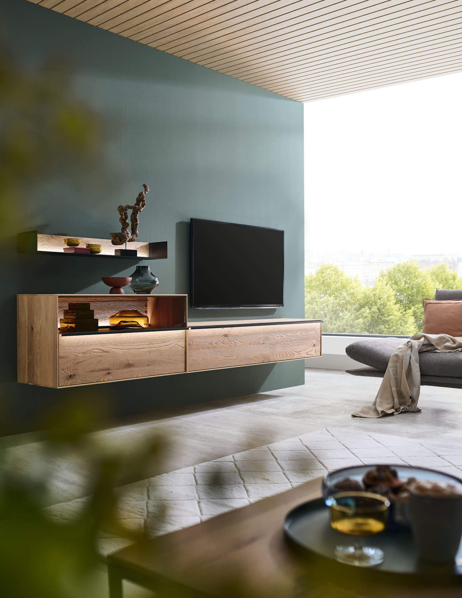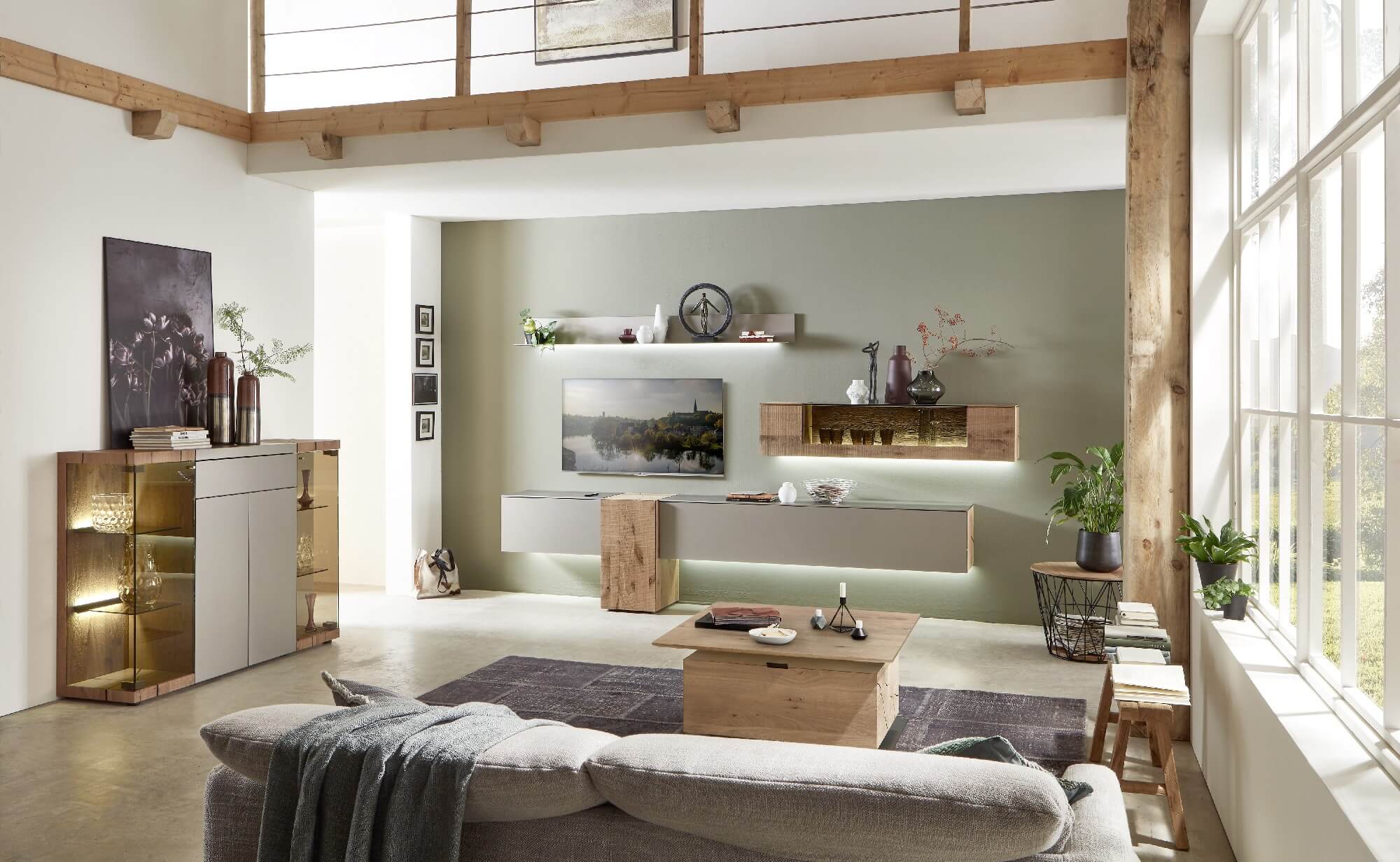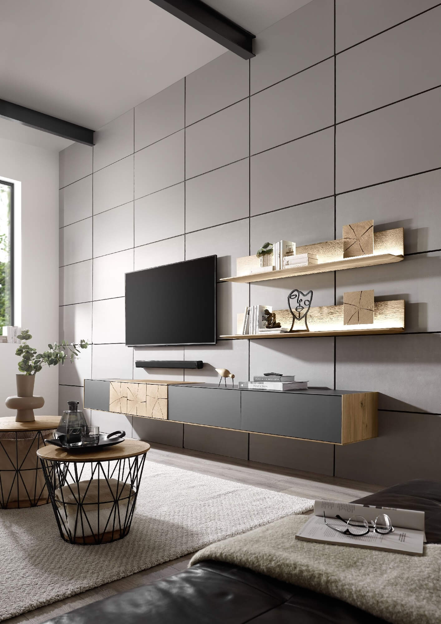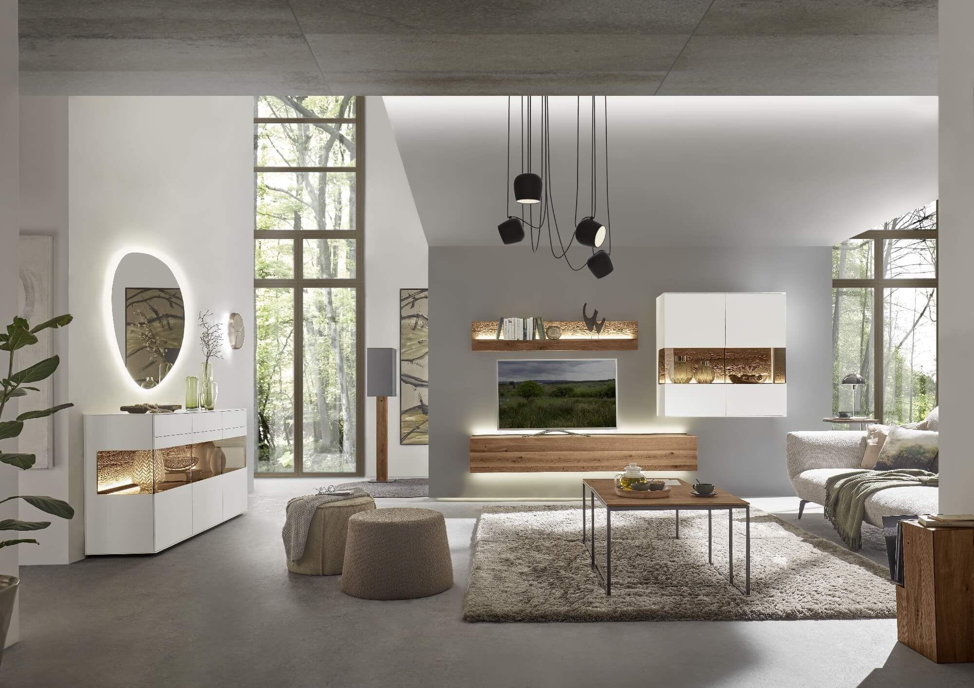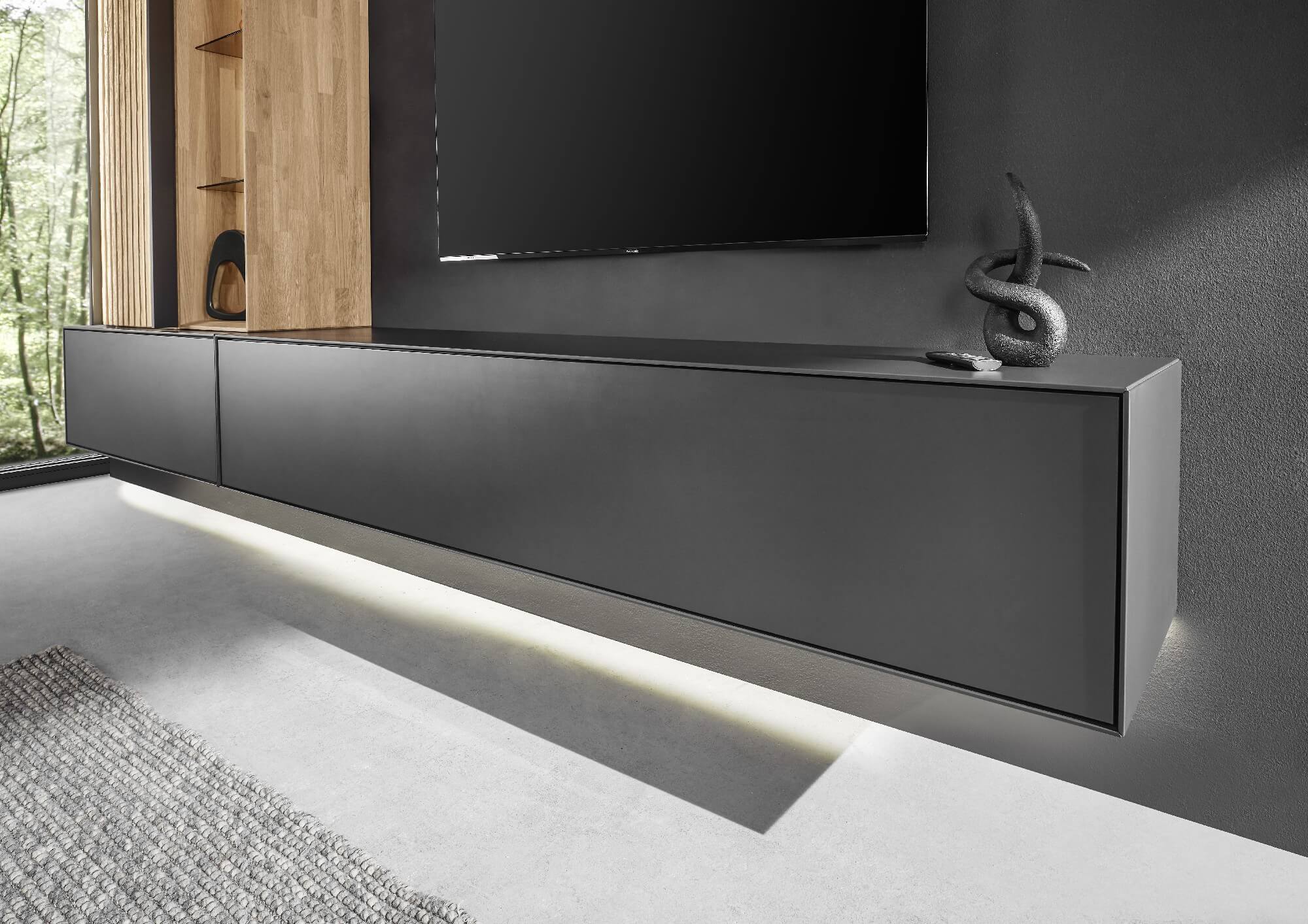Diese Wohlfühlatmosphäre möchten Sie nie wieder verlassen: Frei schwebend wirken die Lowboard- Elemente, mit denen Sie Ihren Wohnraum optimal nutzen können und die mit weiteren Wandelementen kombinierbar sind. Setzen Sie mit der indirekten LED-Beleuchtung besondere Akzente.