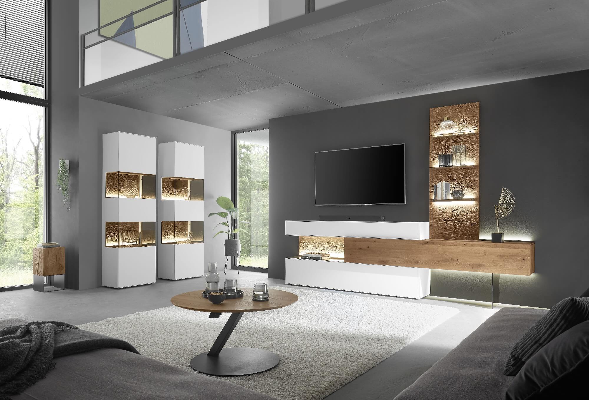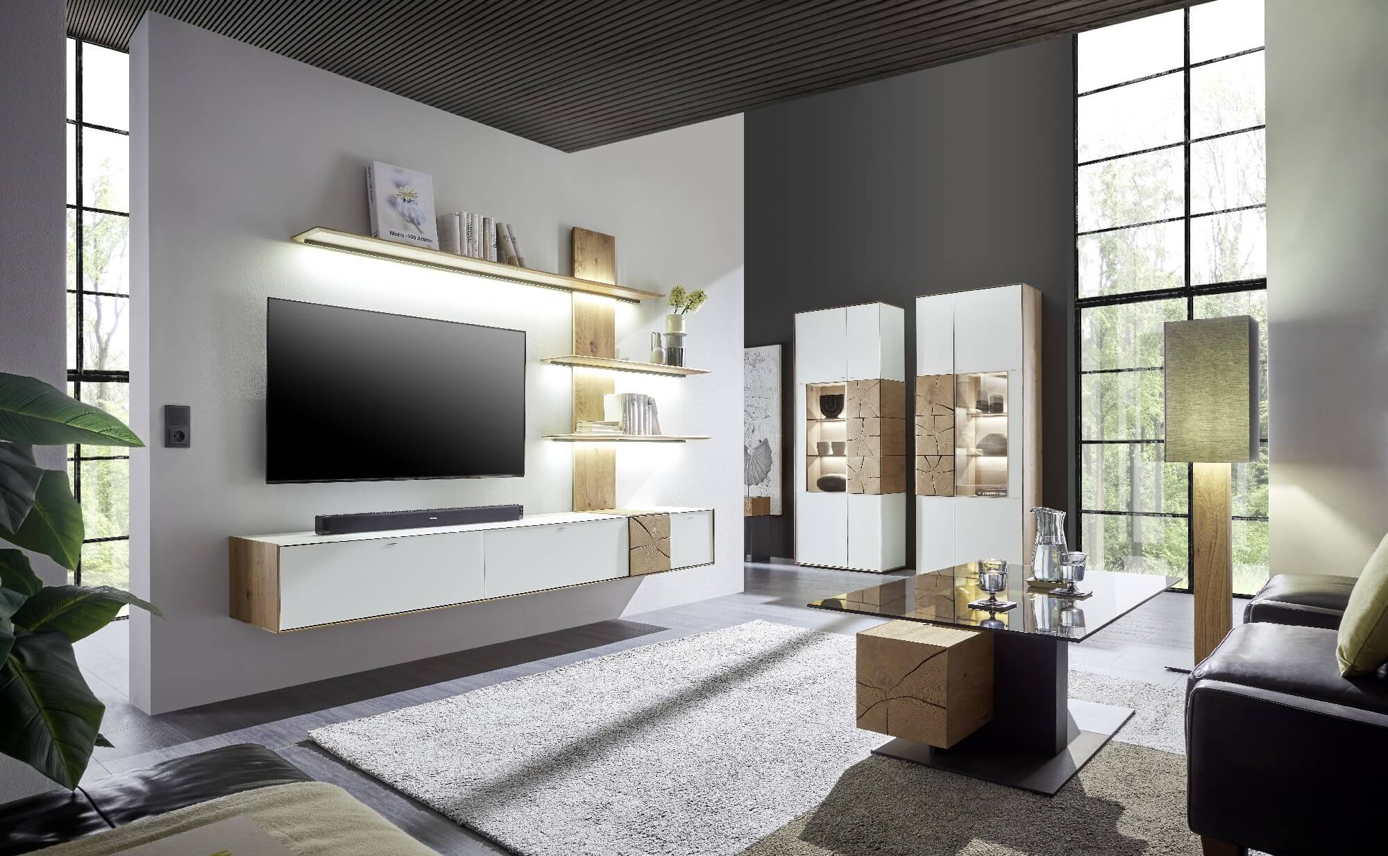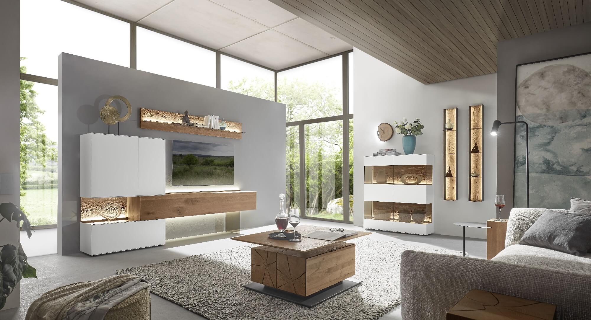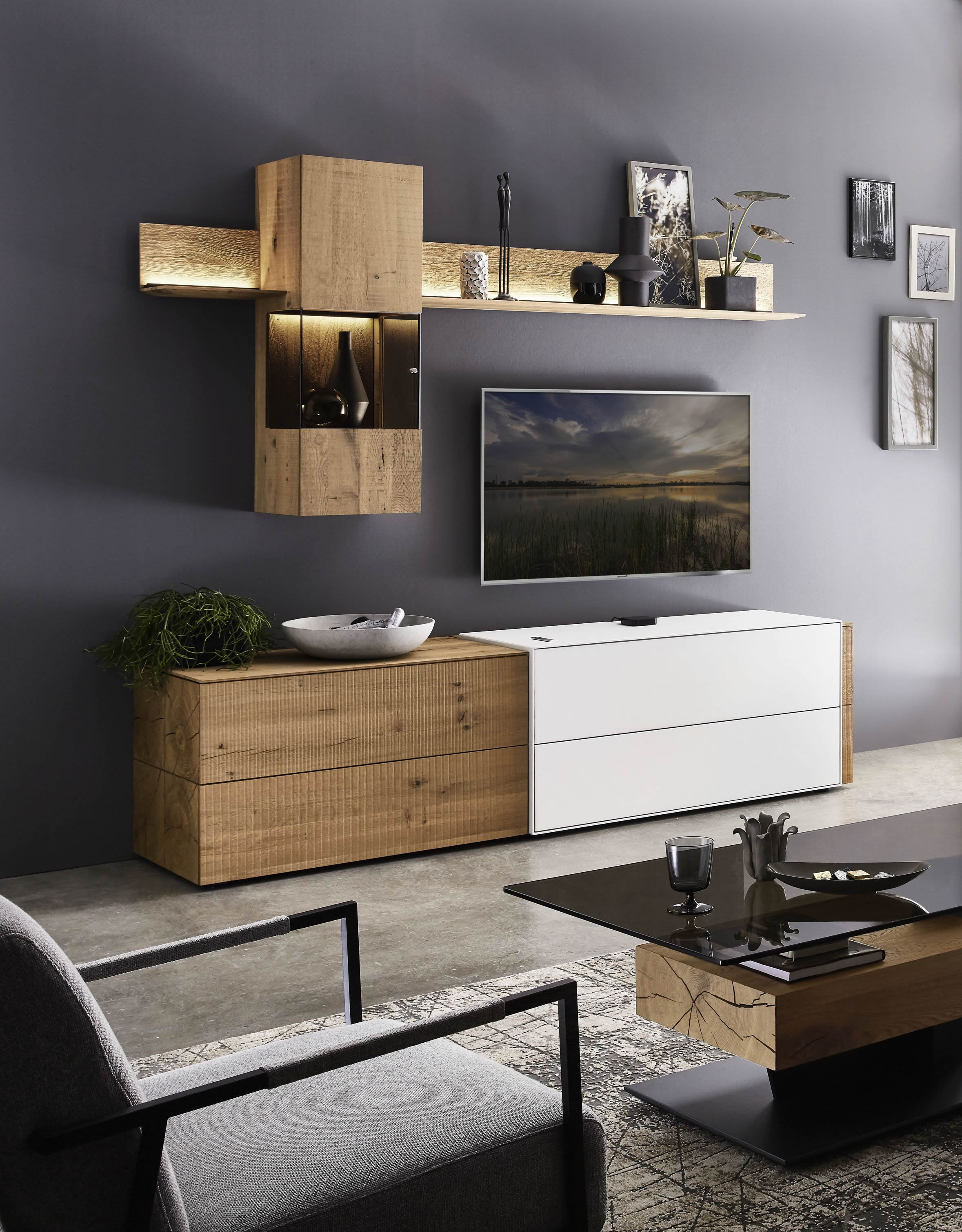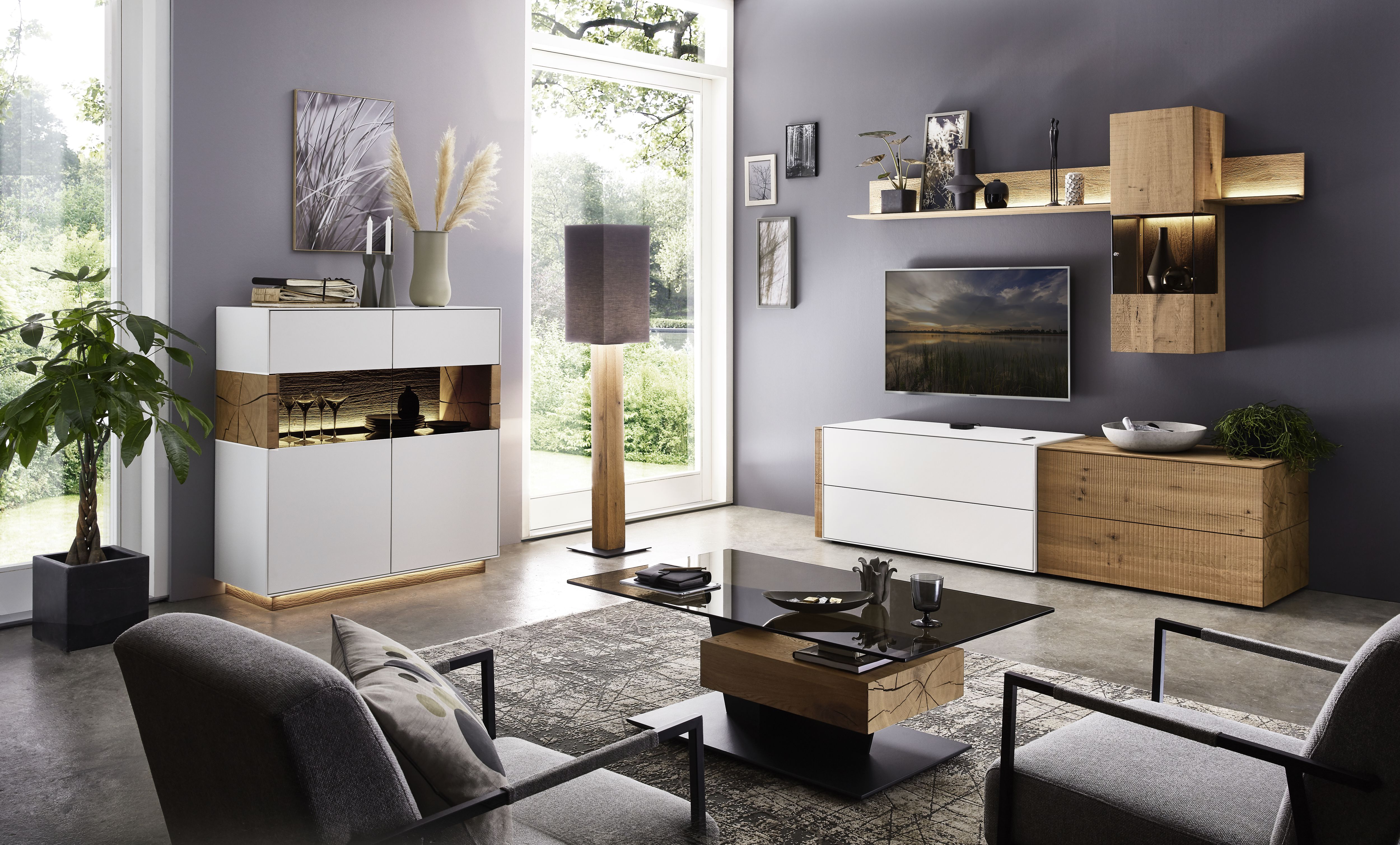 Mit dem Materialmix aus dem Holz der geräucherten Kerneiche und den in Weiß und Anthrazit erhältlichen Glaselementen verschaffen Sie Ihrem Wohn- bereich ein ausgleichendes und beruhigendes Ambiente. Die indirekte Beleuchtung setzt Ihre Möbel optimal in Szene und geht mit dem Holz und den Glaselementen eine perfekte Harmonie ein.