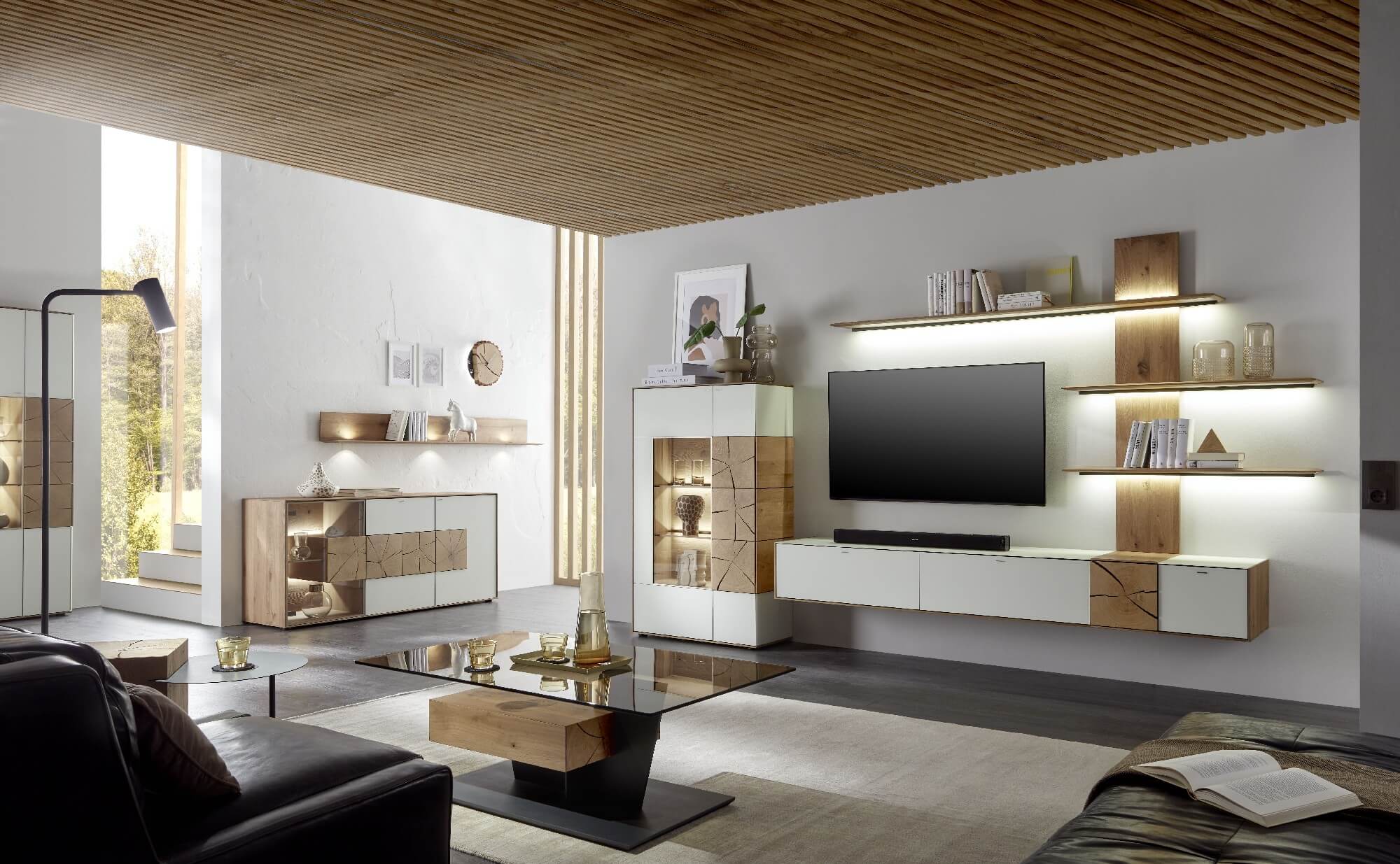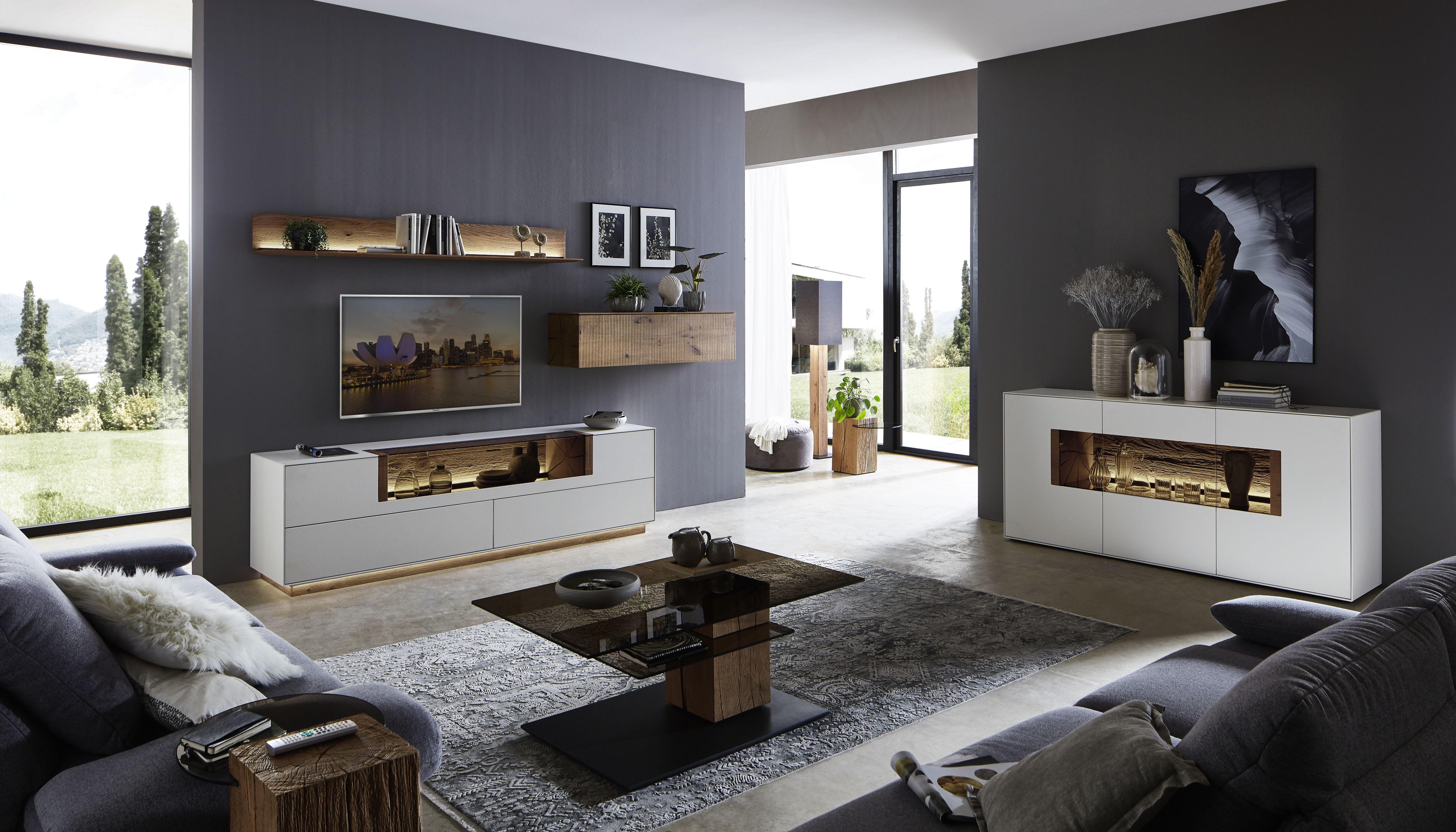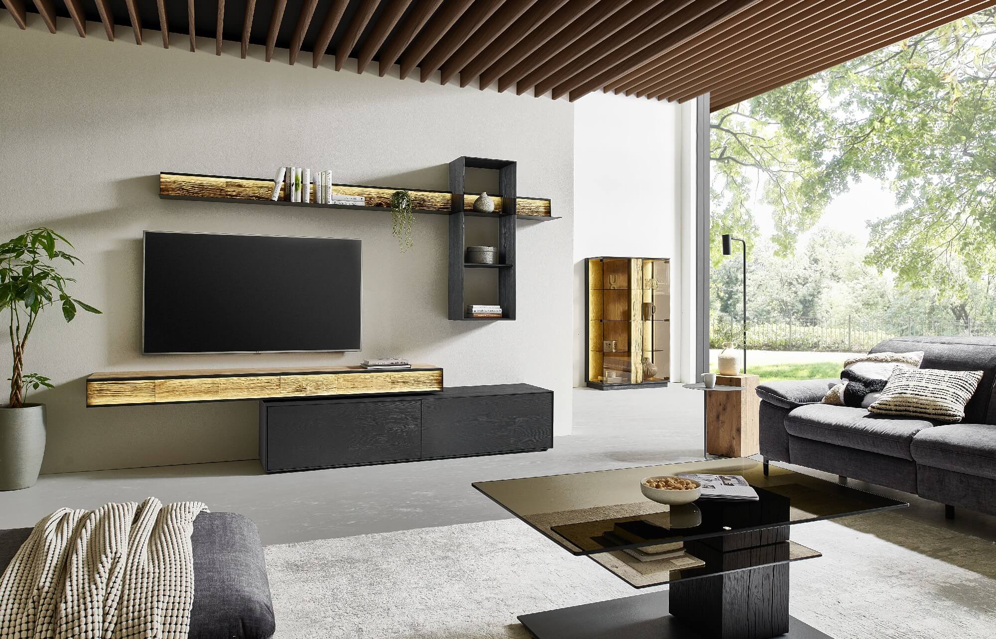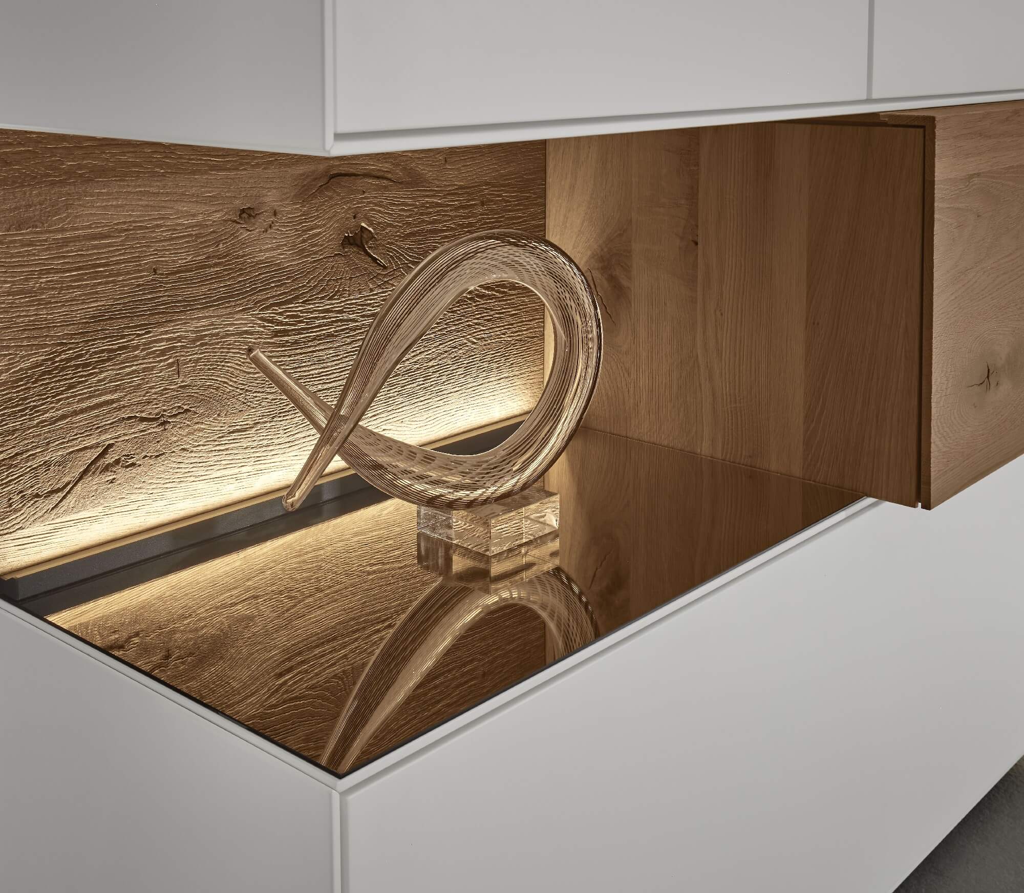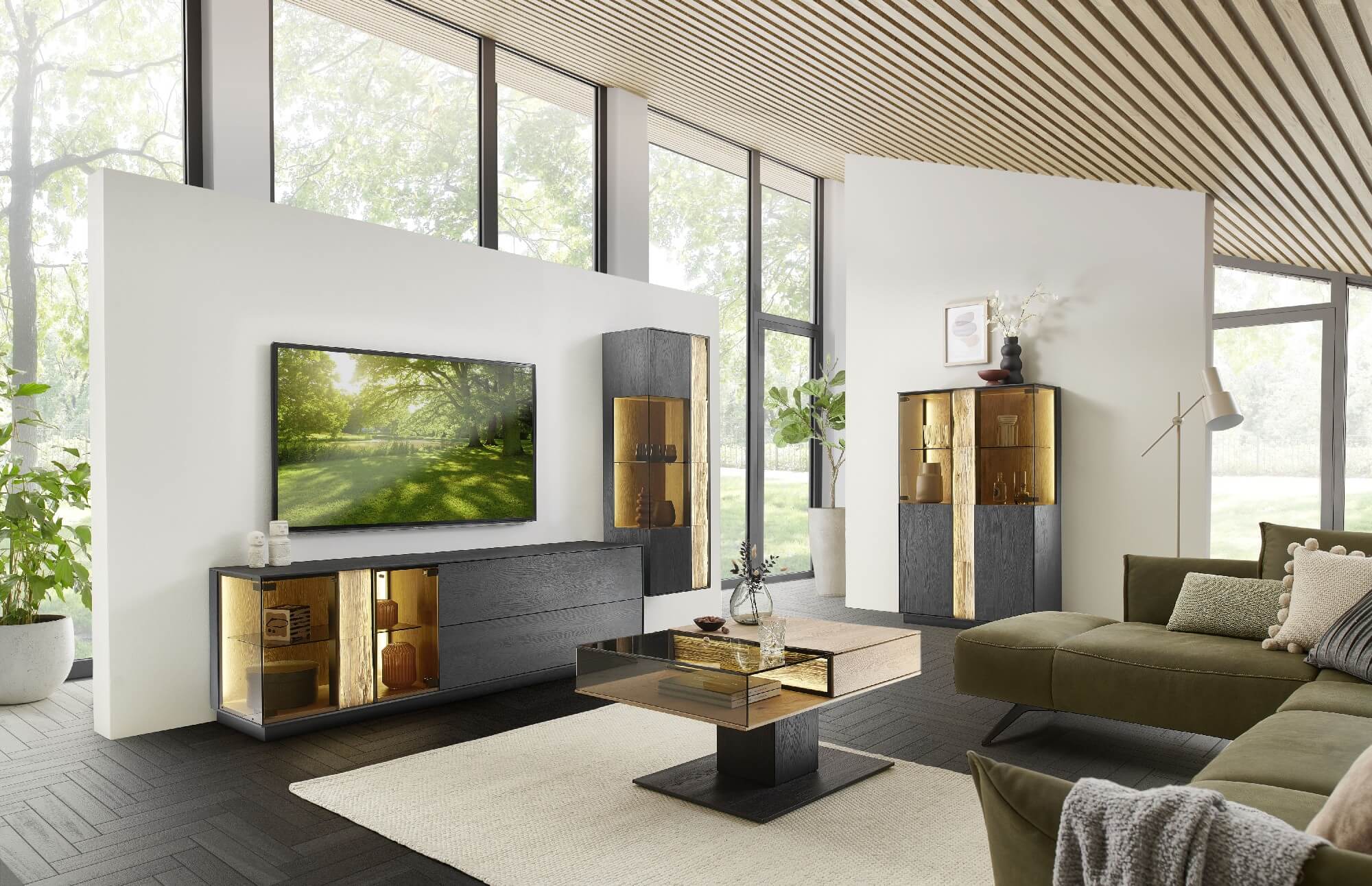 Mit dem Materialmix aus dem Holz der geräucherten Kerneiche und den in Weiß und Anthrazit erhältlichen Glaselementen verschaffen Sie Ihrem Wohn- bereich ein ausgleichendes und beruhigendes Ambiente. Die indirekte Beleuchtung setzt Ihre Möbel optimal in Szene und geht mit dem Holz und den Glaselementen eine perfekte Harmonie ein.