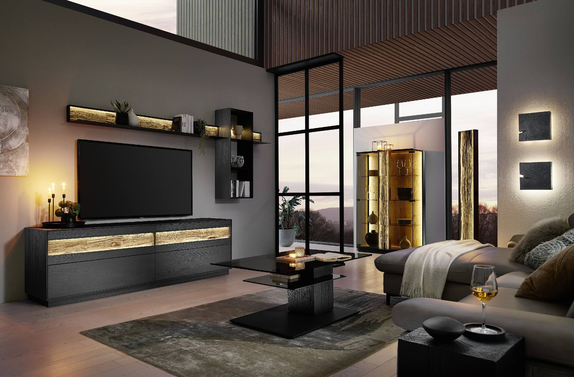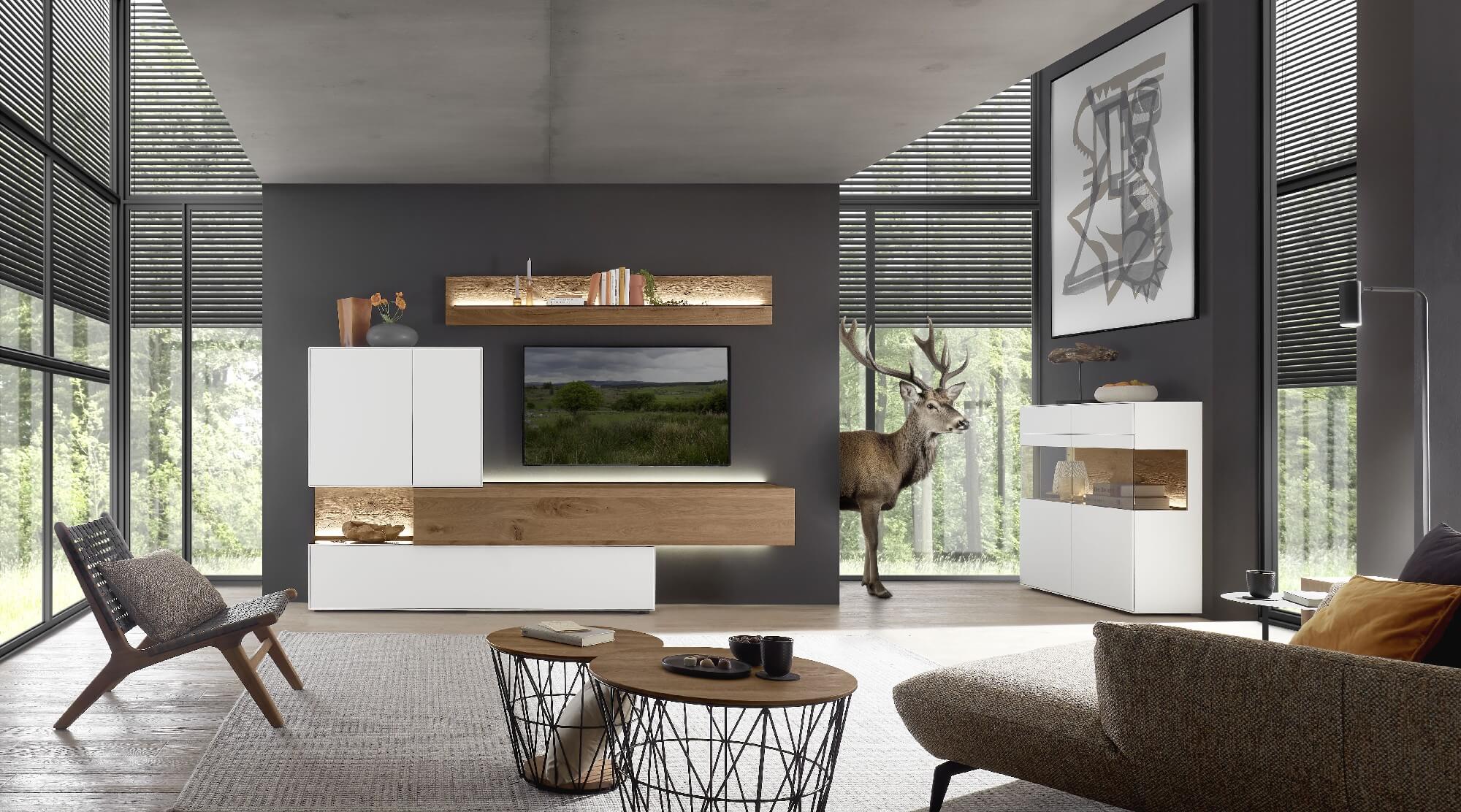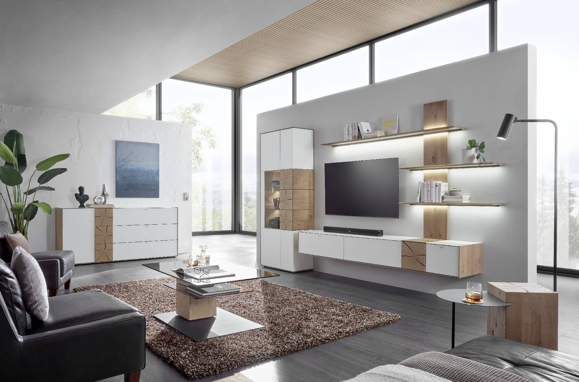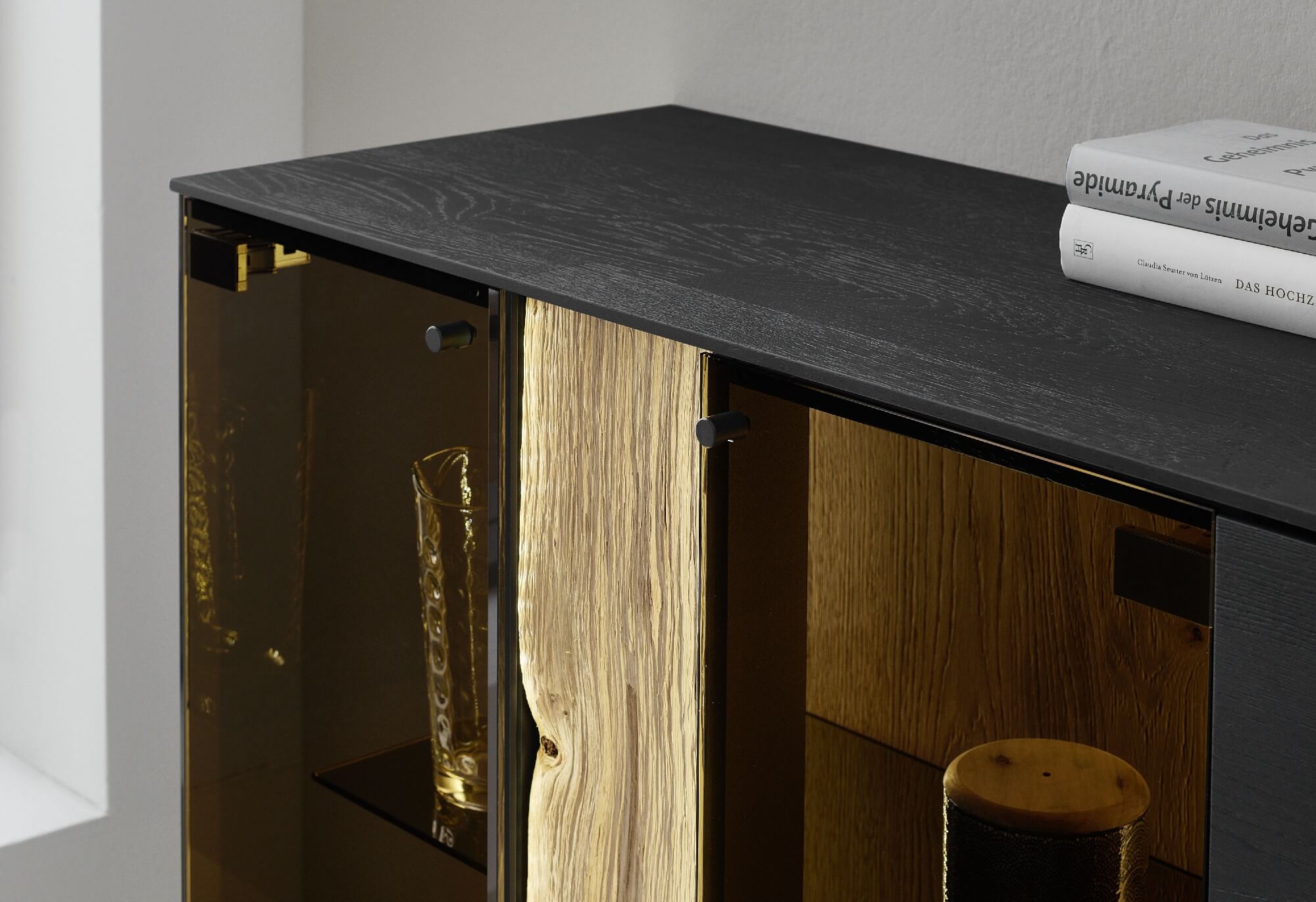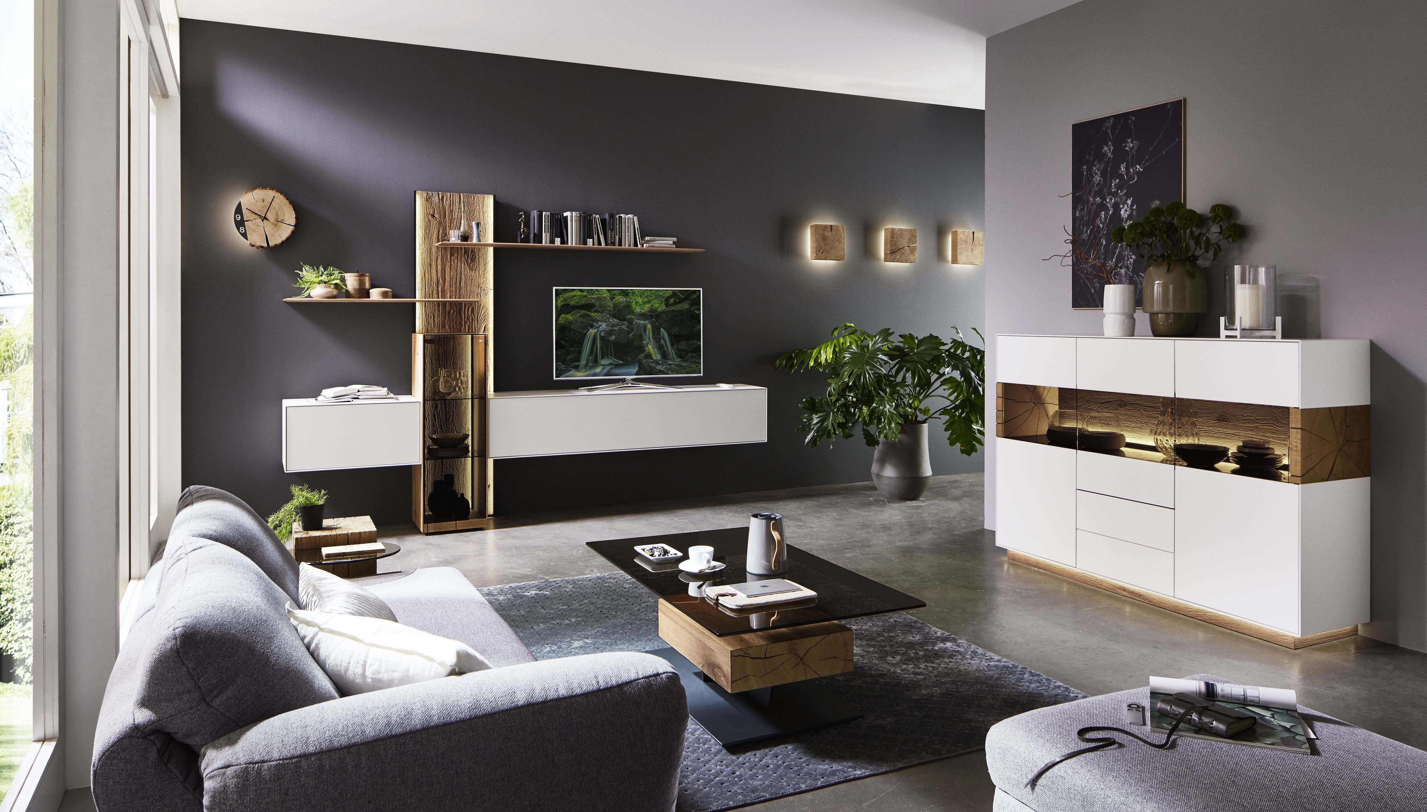 Mit dem Materialmix aus dem Holz der geräucherten Kerneiche und den in Weiß und Anthrazit erhältlichen Glaselementen verschaffen Sie Ihrem Wohn- bereich ein ausgleichendes und beruhigendes Ambiente. Die indirekte Beleuchtung setzt Ihre Möbel optimal in Szene und geht mit dem Holz und den Glaselementen eine perfekte Harmonie ein.