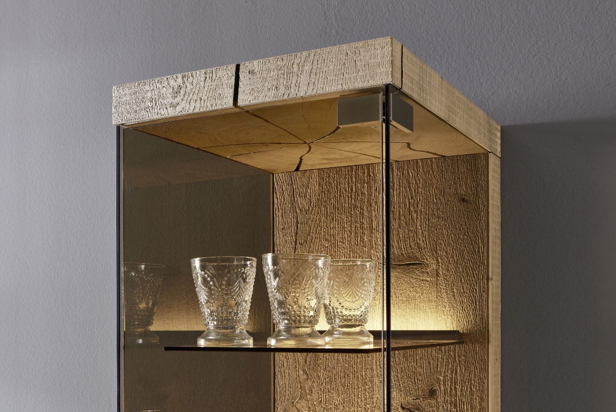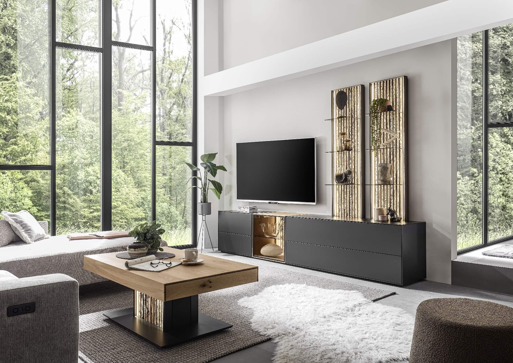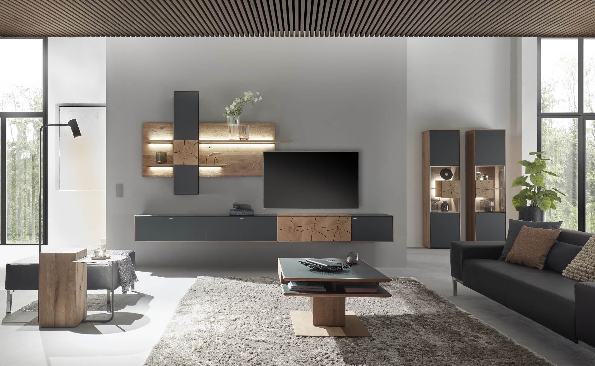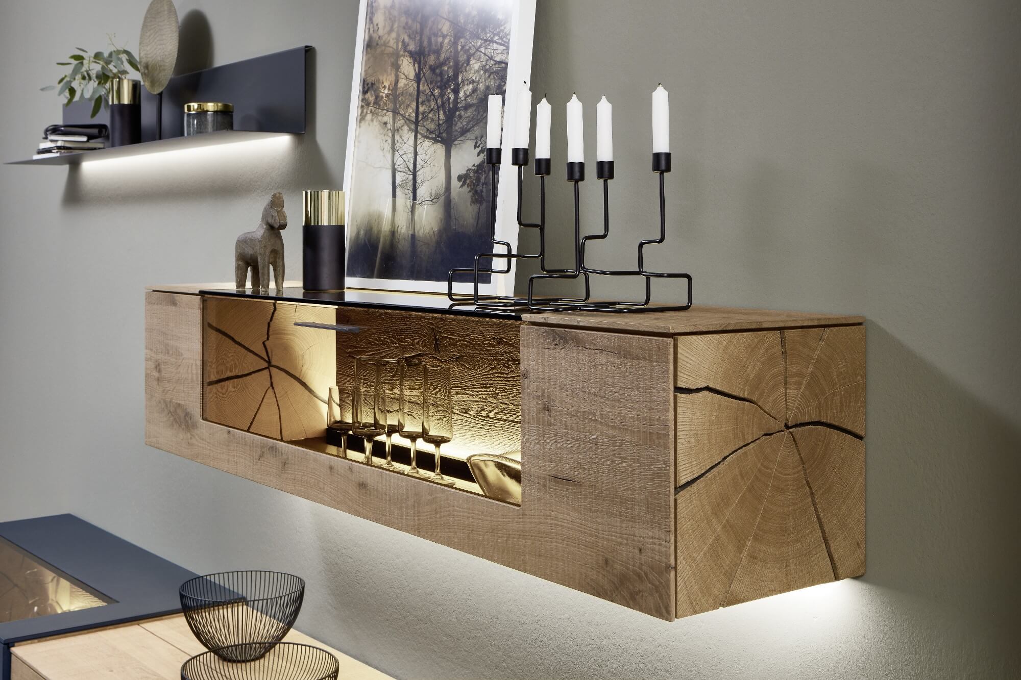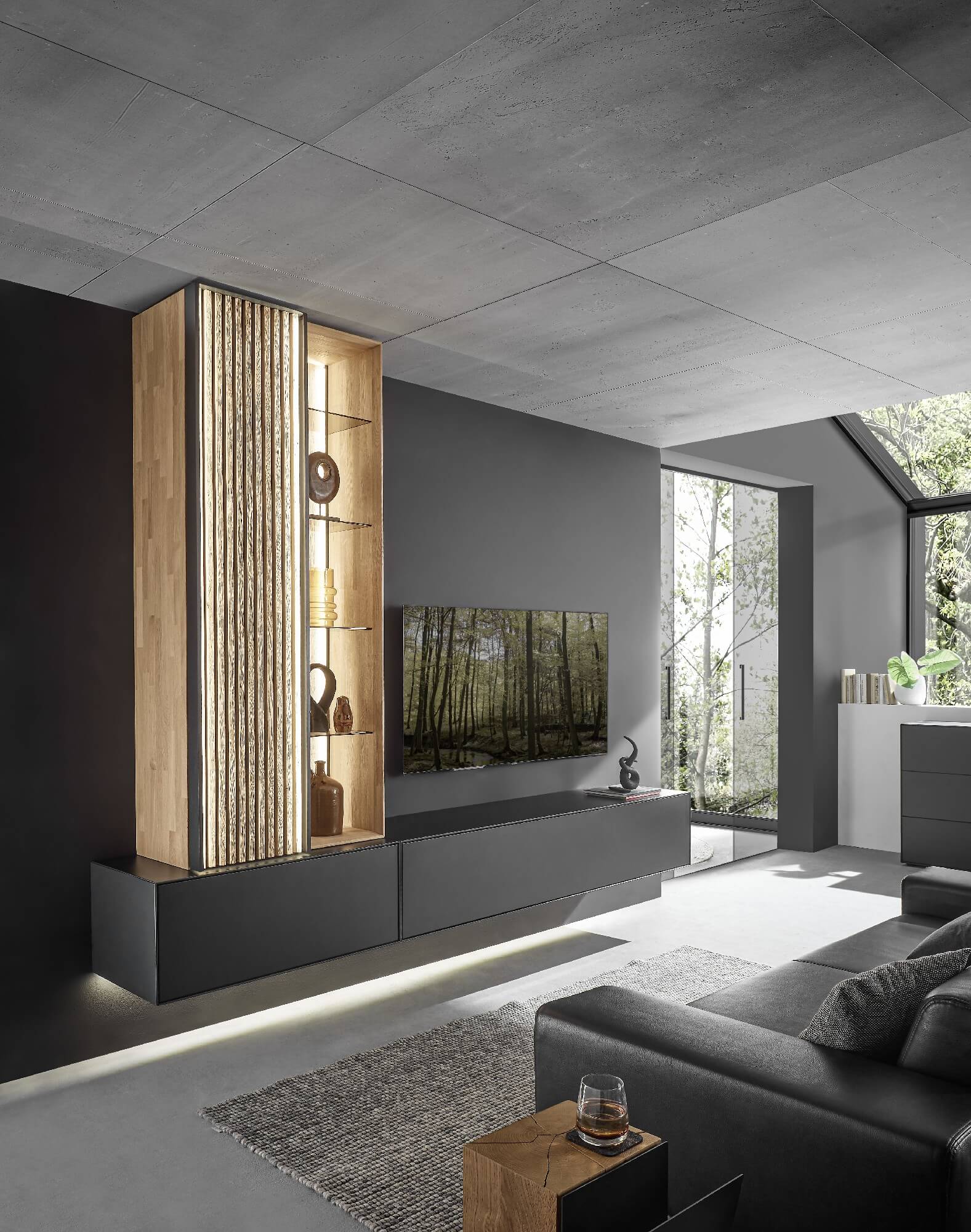 Mit dem Materialmix aus dem Holz der geräucherten Kerneiche und den in Weiß und Anthrazit erhältlichen Glaselementen verschaffen Sie Ihrem Wohn- bereich ein ausgleichendes und beruhigendes Ambiente. Die indirekte Beleuchtung setzt Ihre Möbel optimal in Szene und geht mit dem Holz und den Glaselementen eine perfekte Harmonie ein.