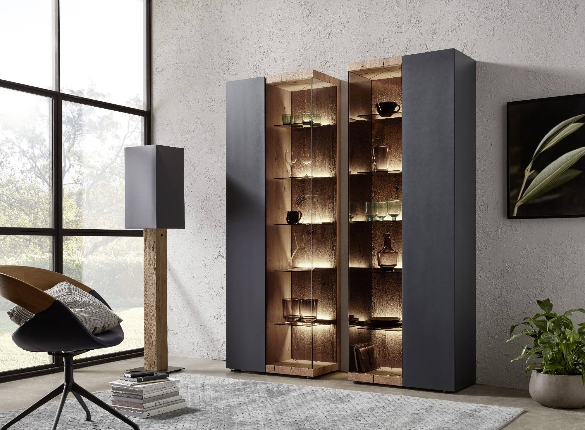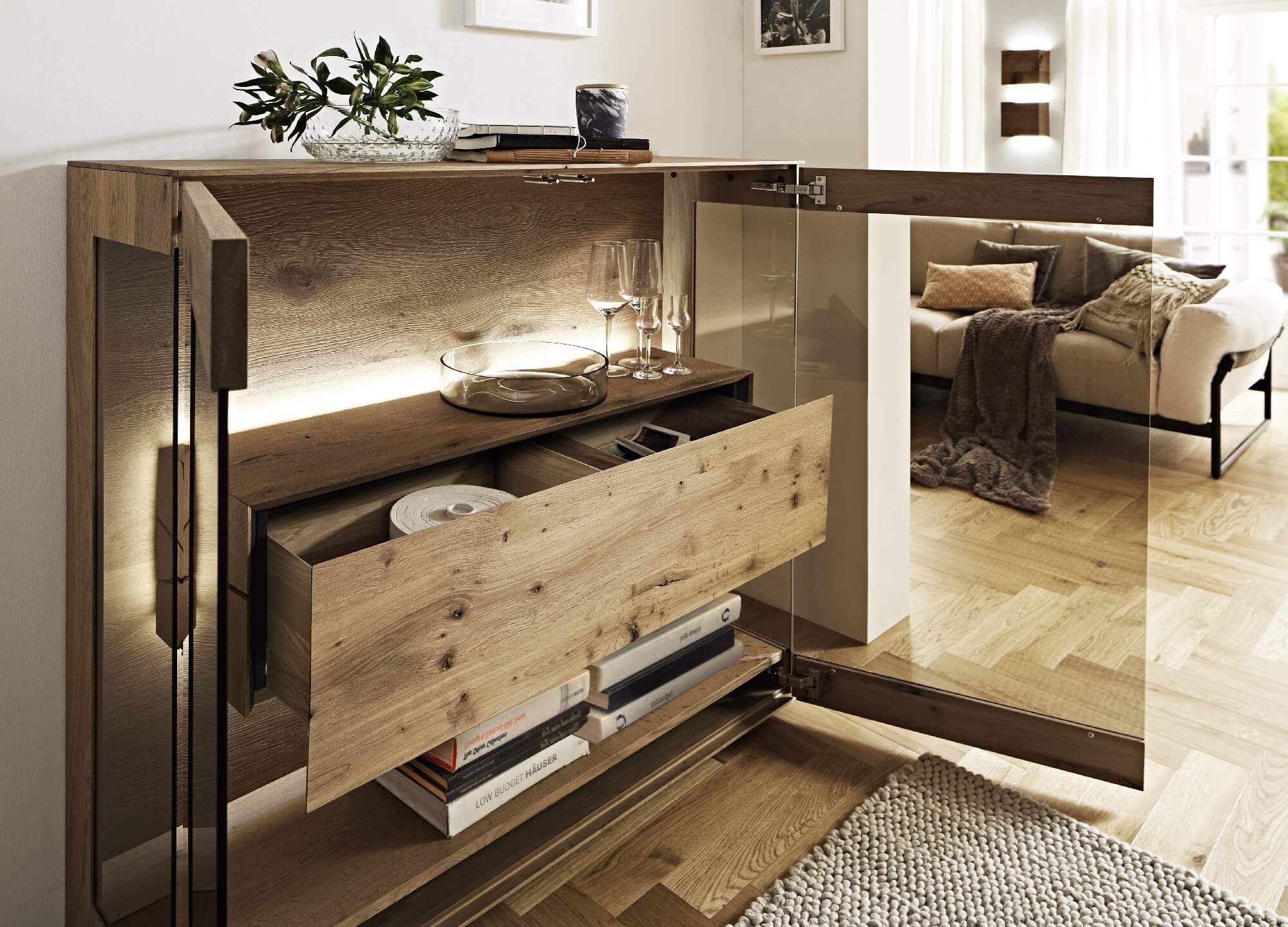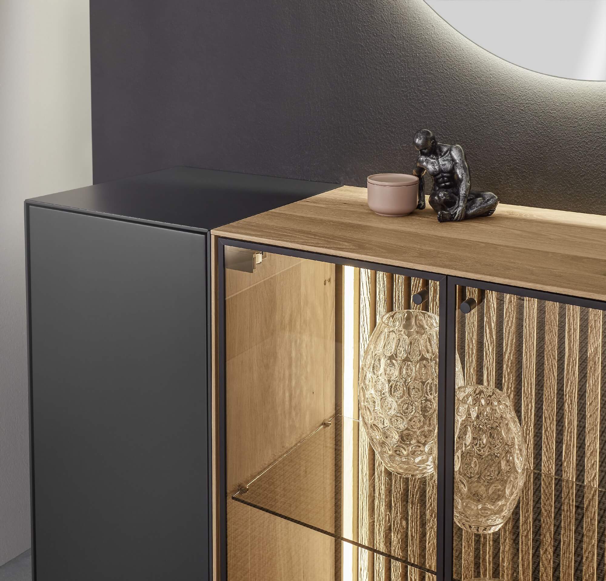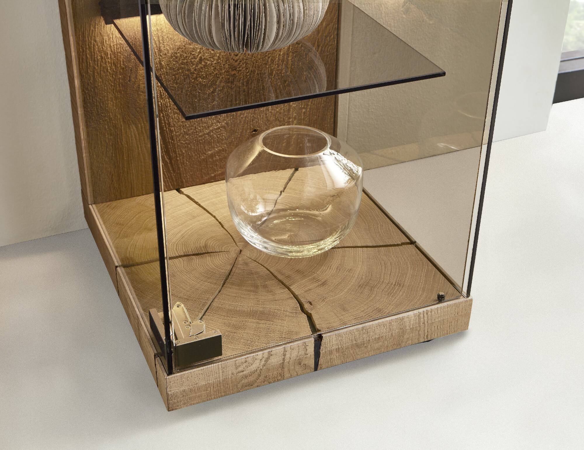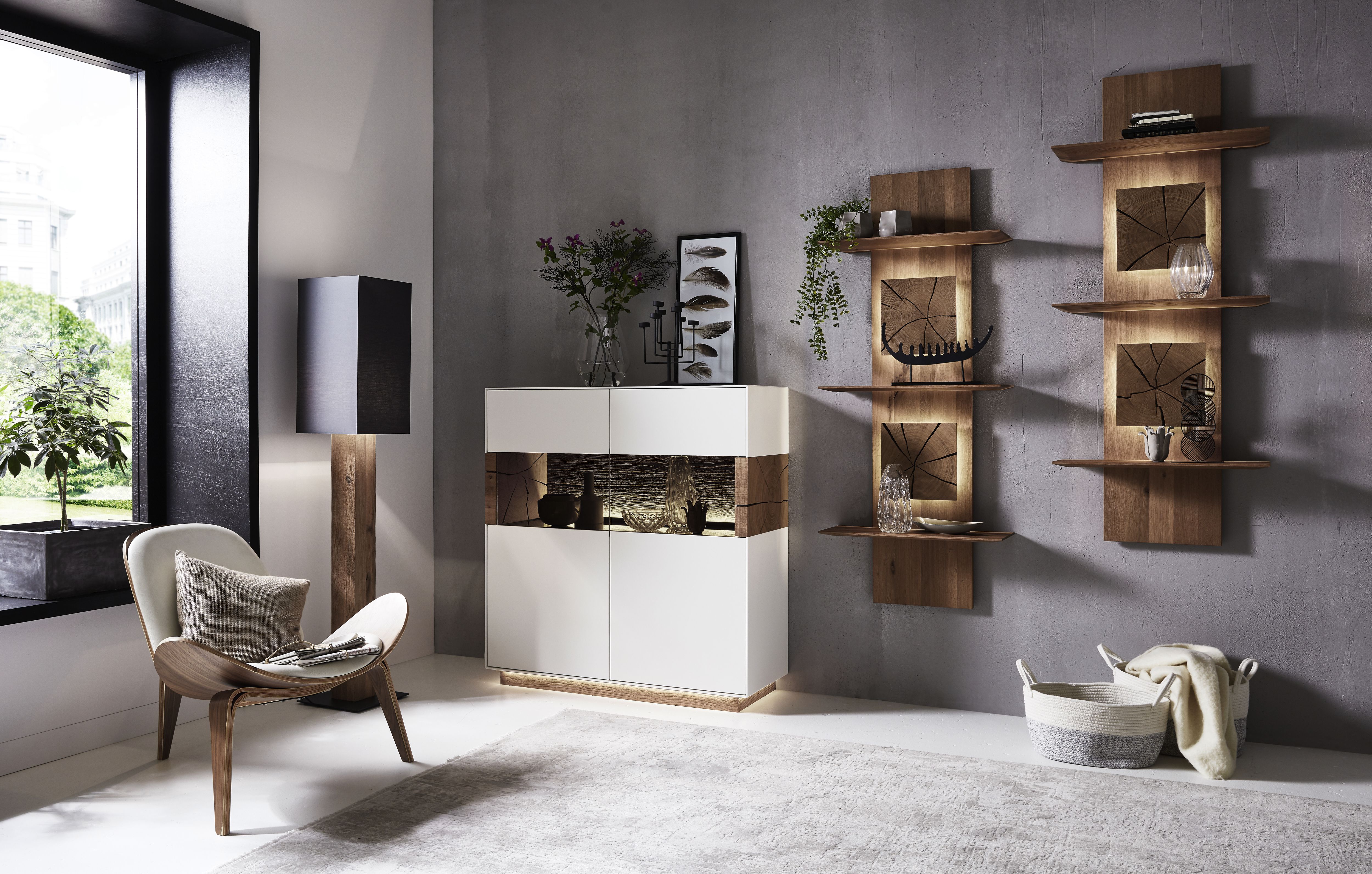 Mit dem Materialmix aus dem Holz der geräucherten Kerneiche und den in Weiß und Anthrazit erhältlichen Glaselementen verschaffen Sie Ihrem Wohn- bereich ein ausgleichendes und beruhigendes Ambiente. Die indirekte Beleuchtung setzt Ihre Möbel optimal in Szene und geht mit dem Holz und den Glaselementen eine perfekte Harmonie ein.