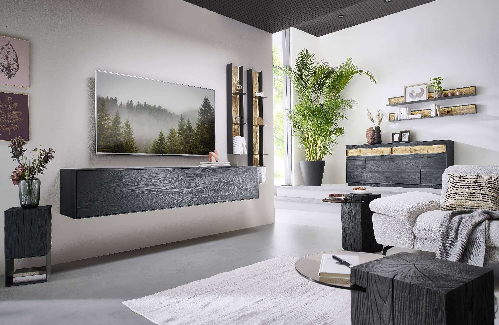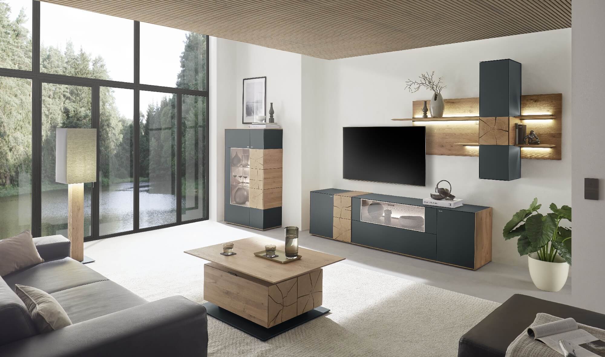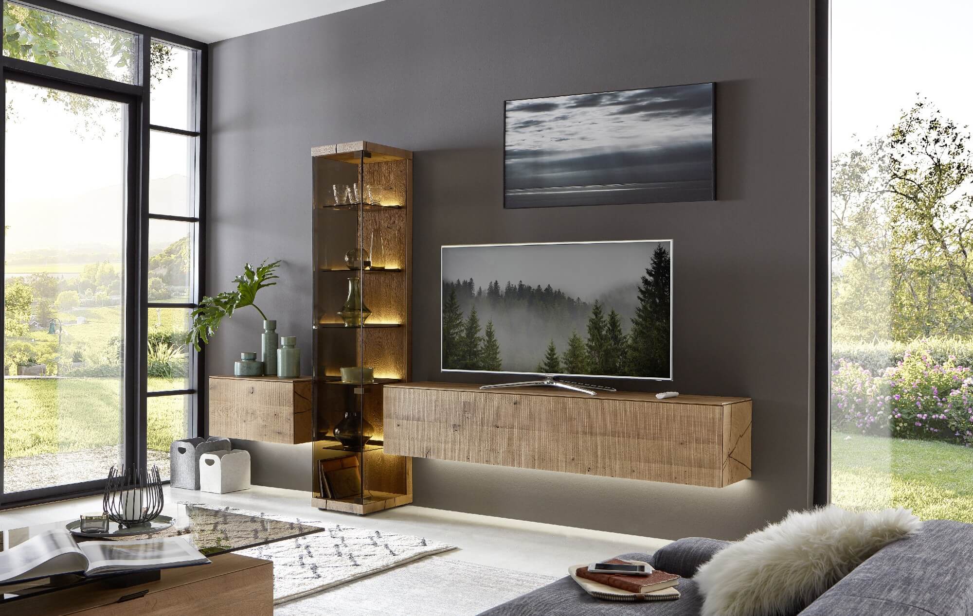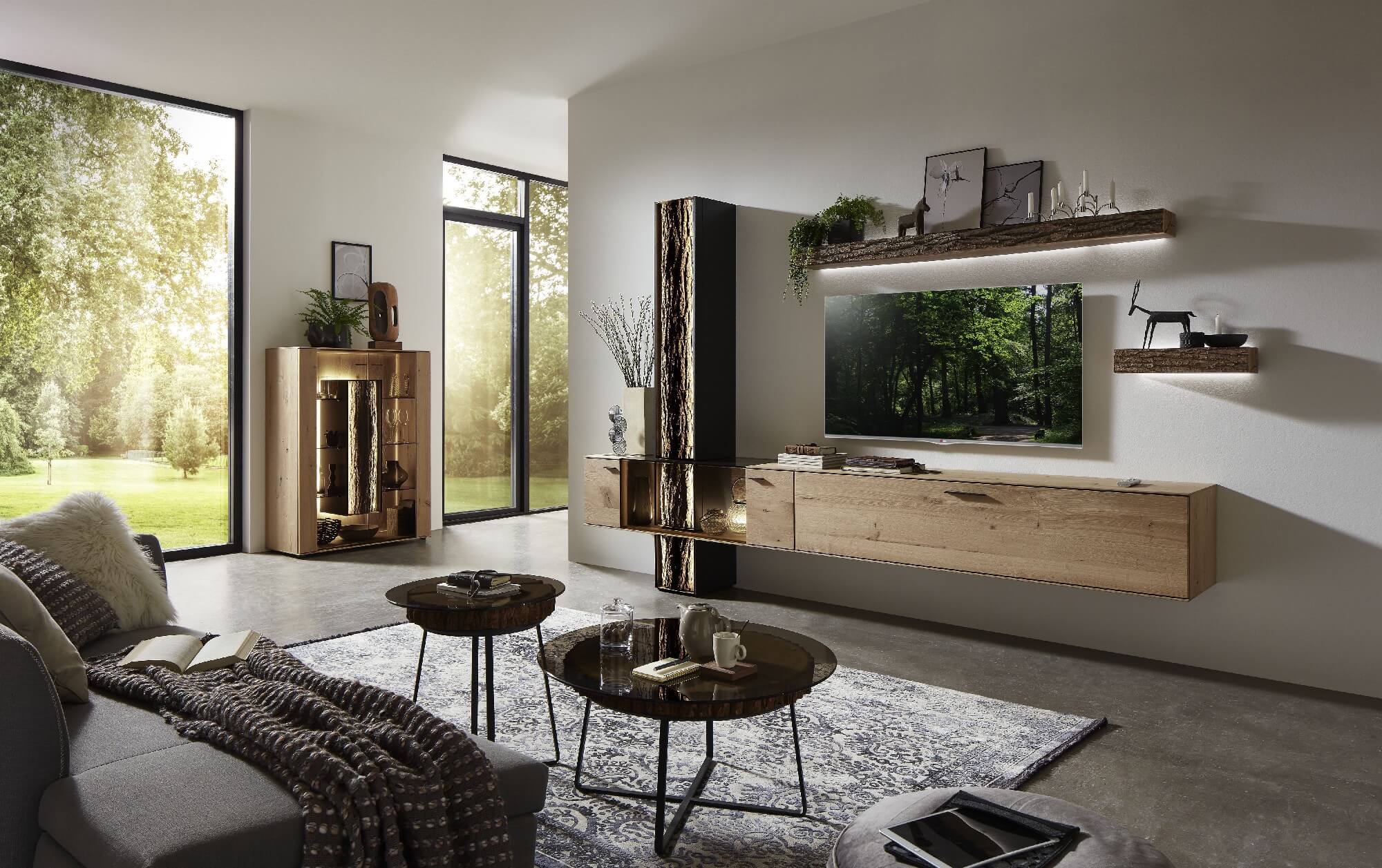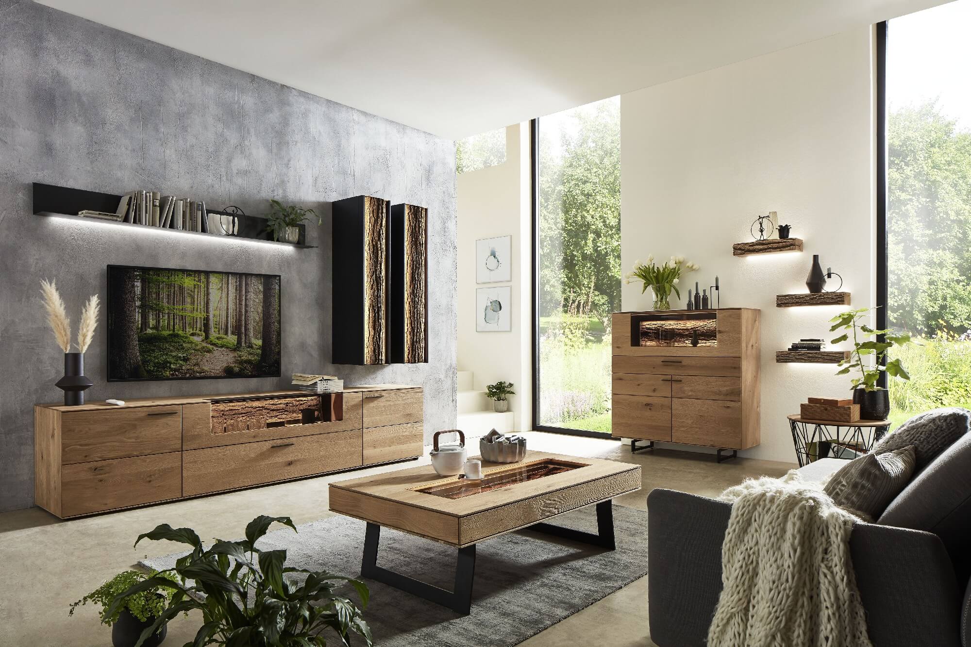 Mit dem Materialmix aus dem Holz der geräucherten Kerneiche und den in Weiß und Anthrazit erhältlichen Glaselementen verschaffen Sie Ihrem Wohn- bereich ein ausgleichendes und beruhigendes Ambiente. Die indirekte Beleuchtung setzt Ihre Möbel optimal in Szene und geht mit dem Holz und den Glaselementen eine perfekte Harmonie ein.