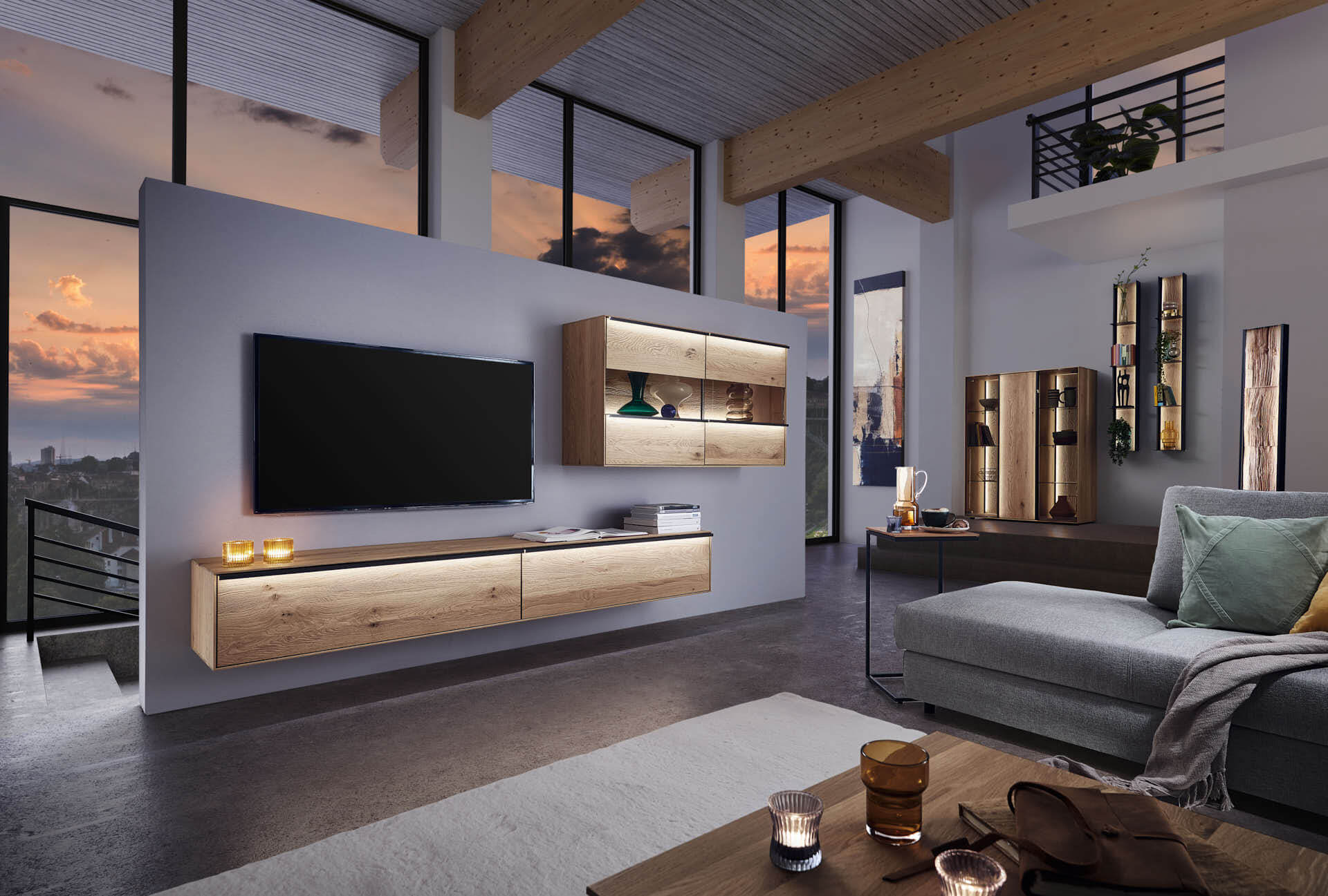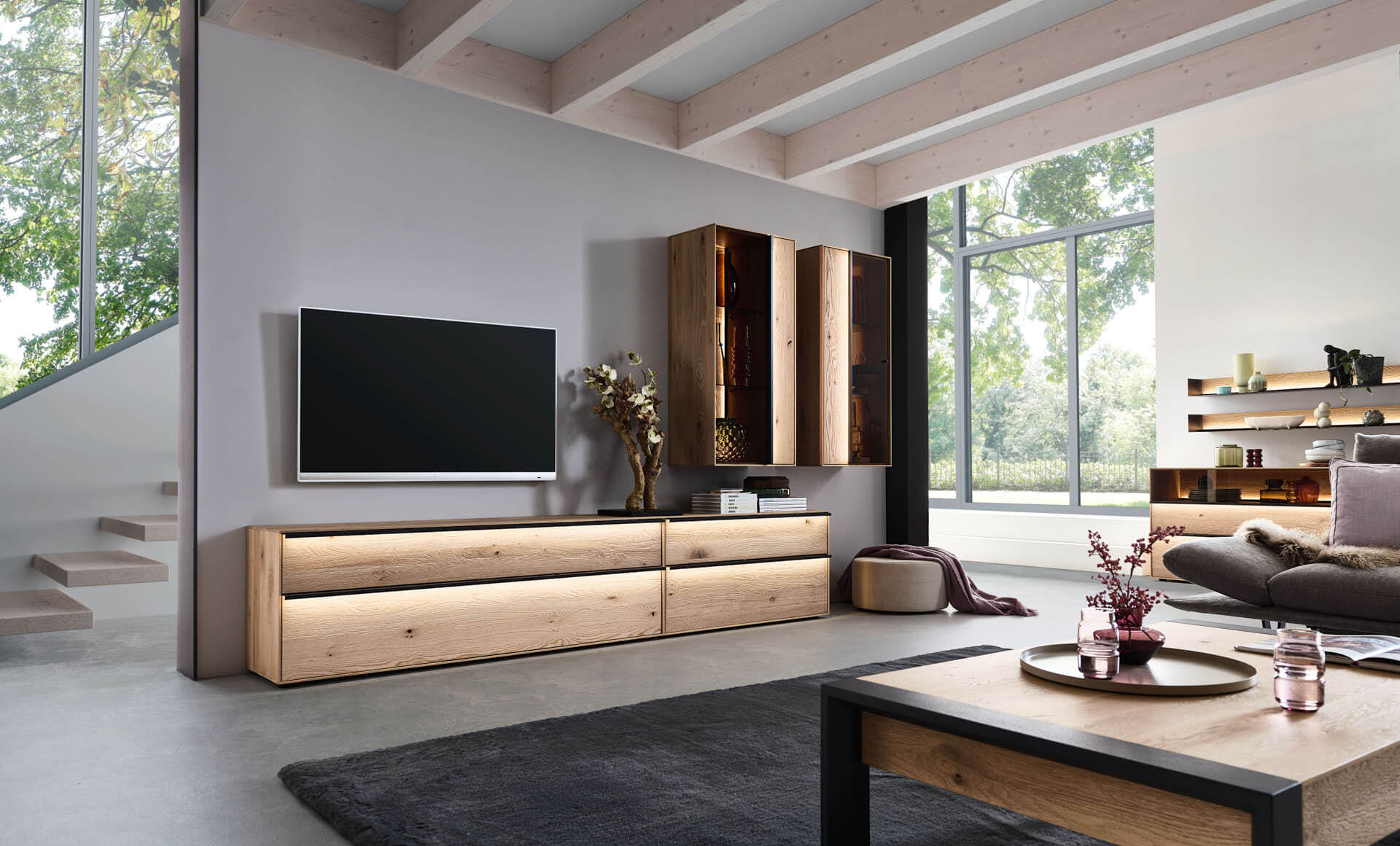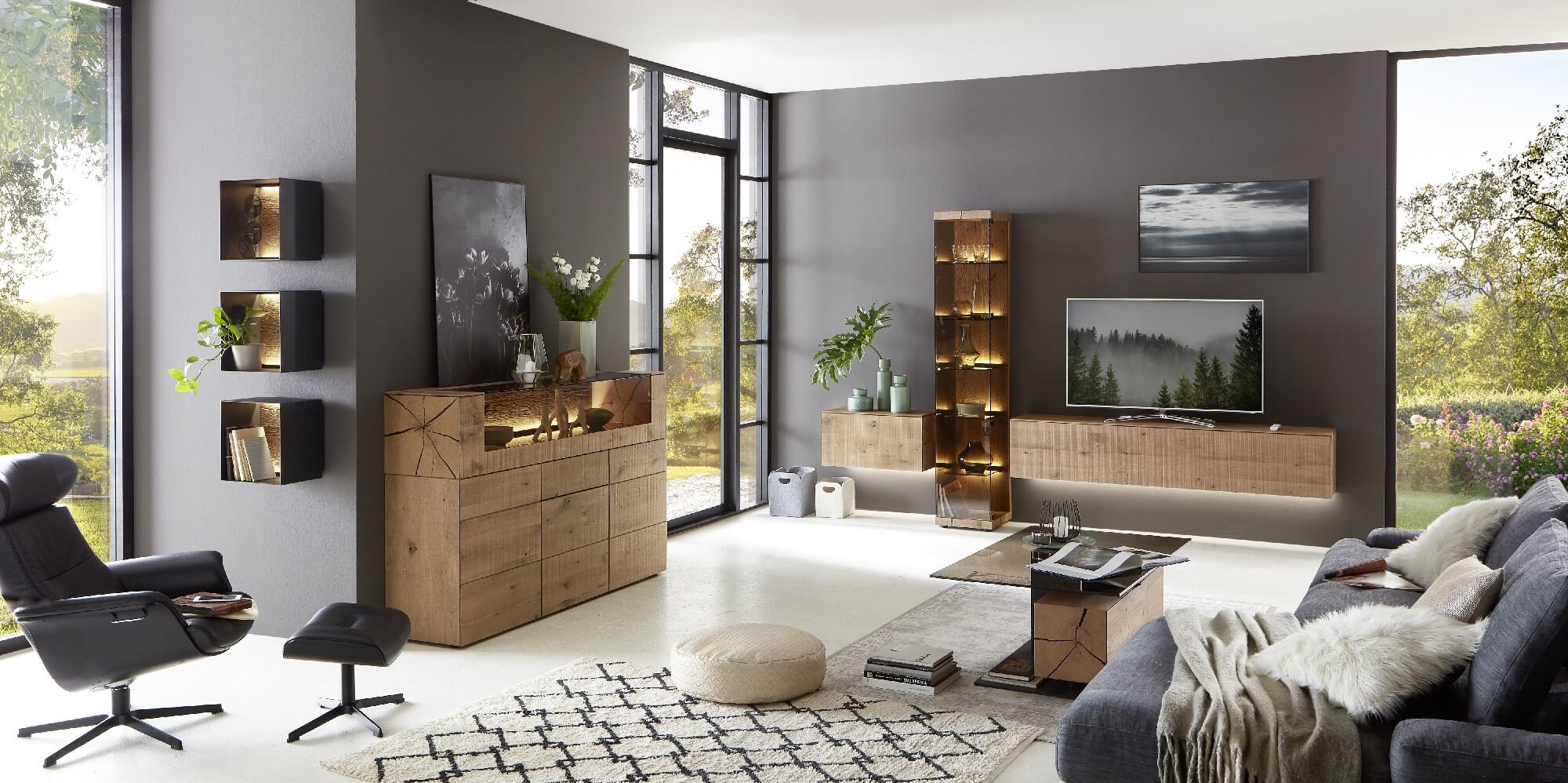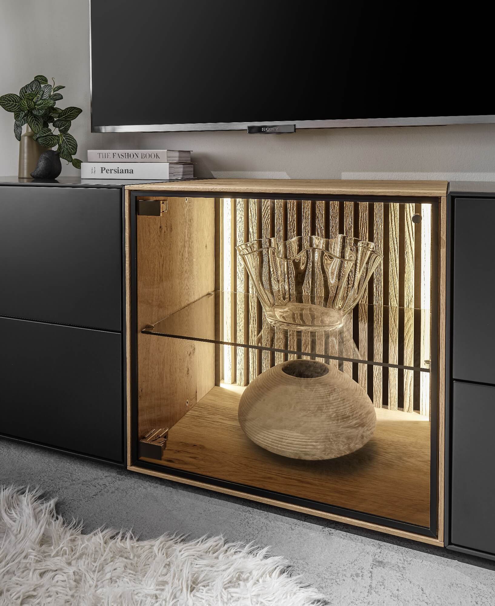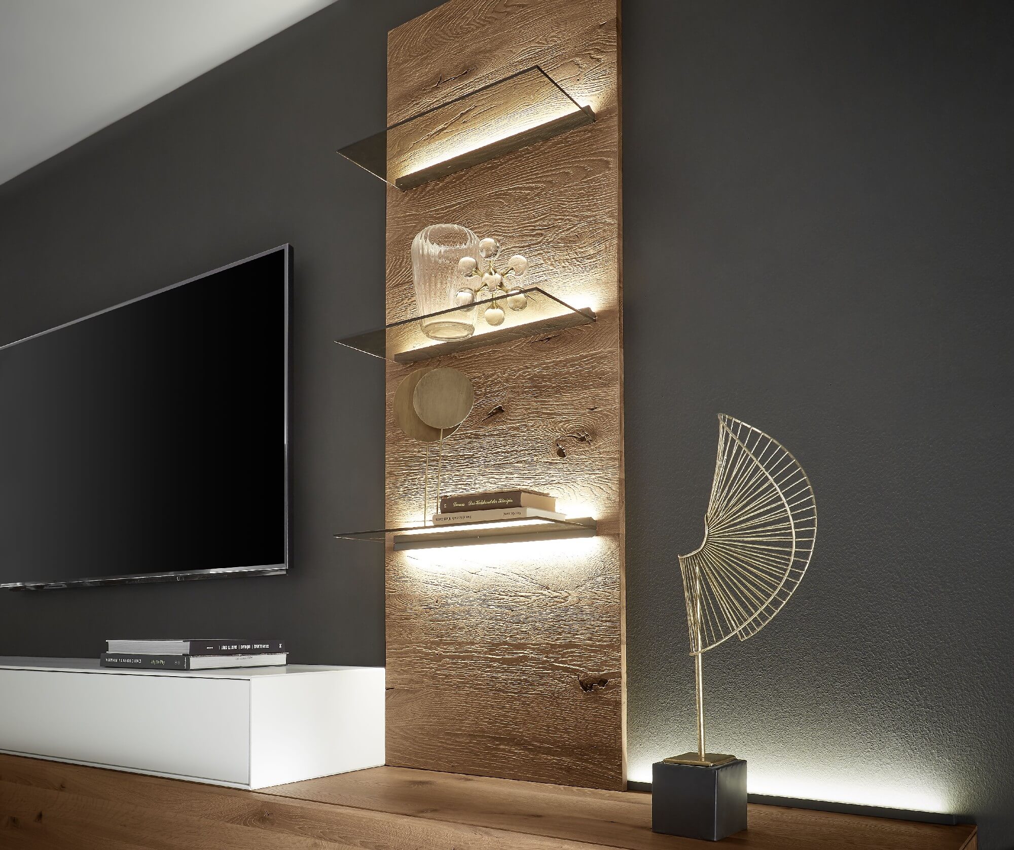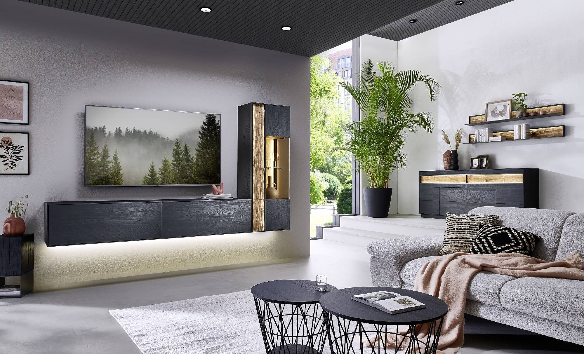 Mit dem Materialmix aus dem Holz der geräucherten Kerneiche und den in Weiß und Anthrazit erhältlichen Glaselementen verschaffen Sie Ihrem Wohn- bereich ein ausgleichendes und beruhigendes Ambiente. Die indirekte Beleuchtung setzt Ihre Möbel optimal in Szene und geht mit dem Holz und den Glaselementen eine perfekte Harmonie ein.