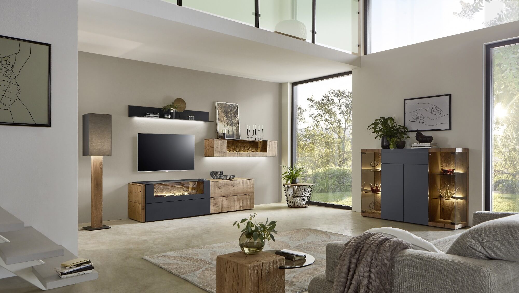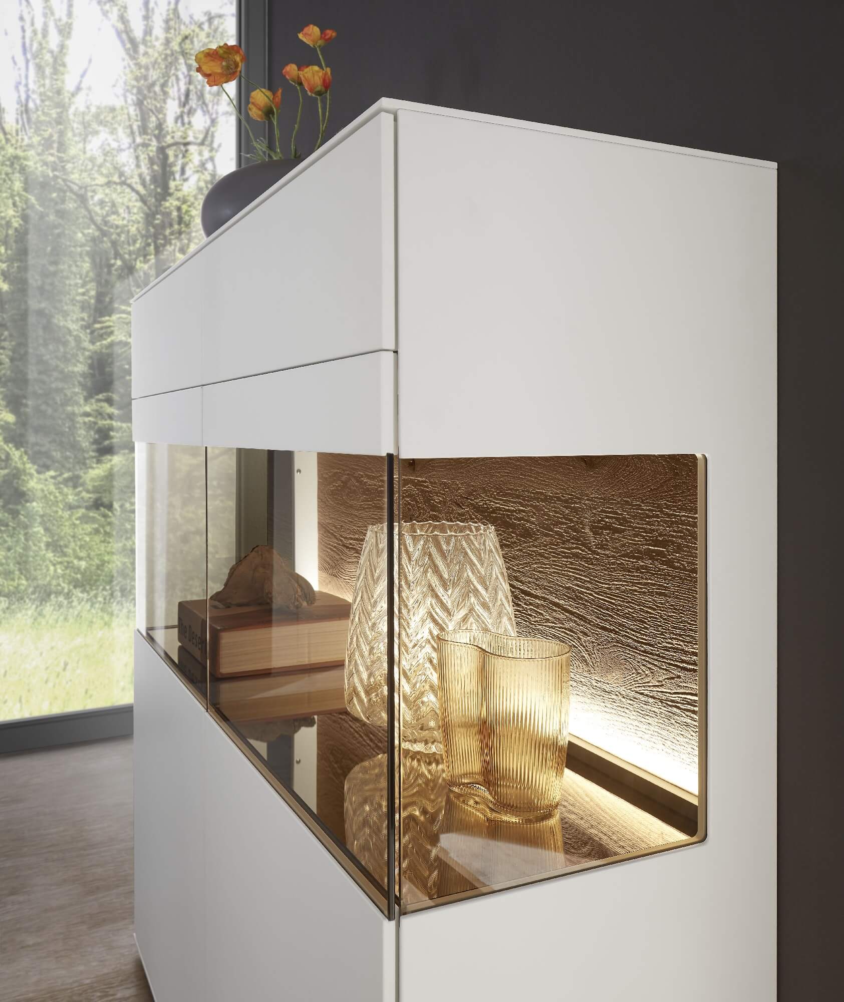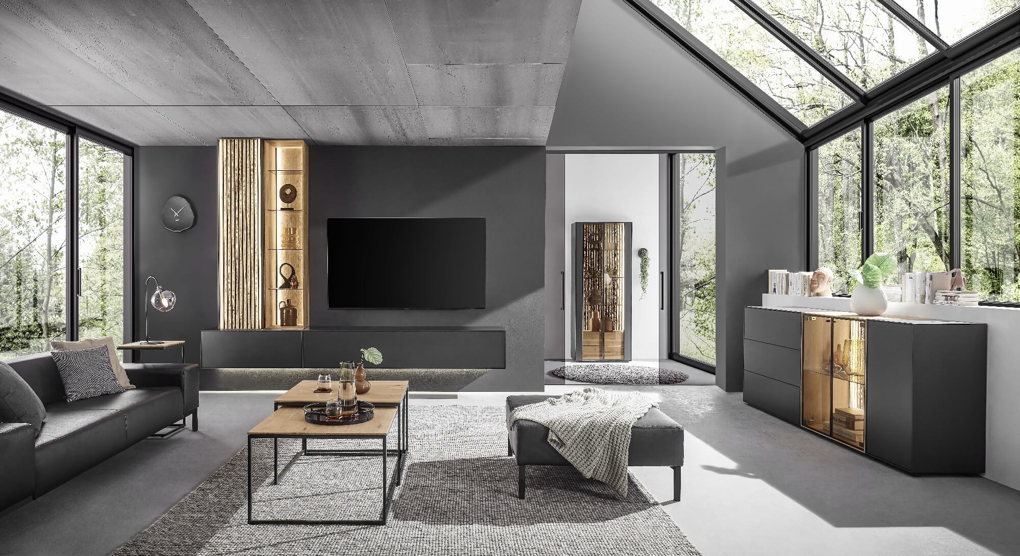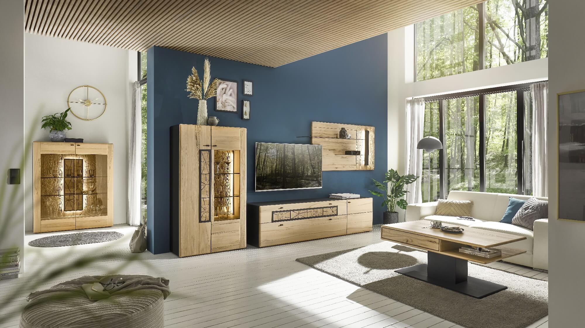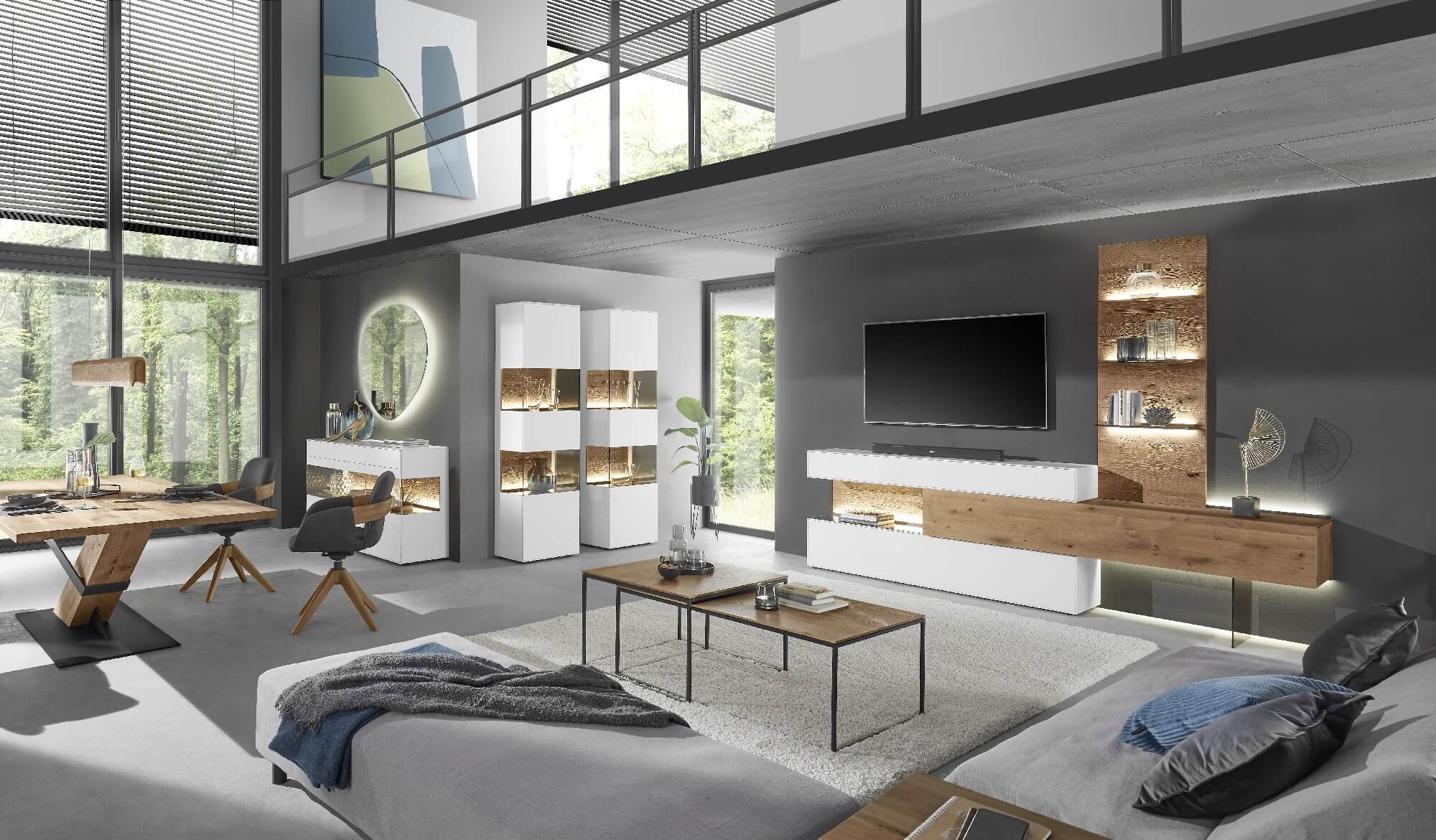 Mit dem Materialmix aus dem Holz der geräucherten Kerneiche und den in Weiß und Anthrazit erhältlichen Glaselementen verschaffen Sie Ihrem Wohn- bereich ein ausgleichendes und beruhigendes Ambiente. Die indirekte Beleuchtung setzt Ihre Möbel optimal in Szene und geht mit dem Holz und den Glaselementen eine perfekte Harmonie ein.