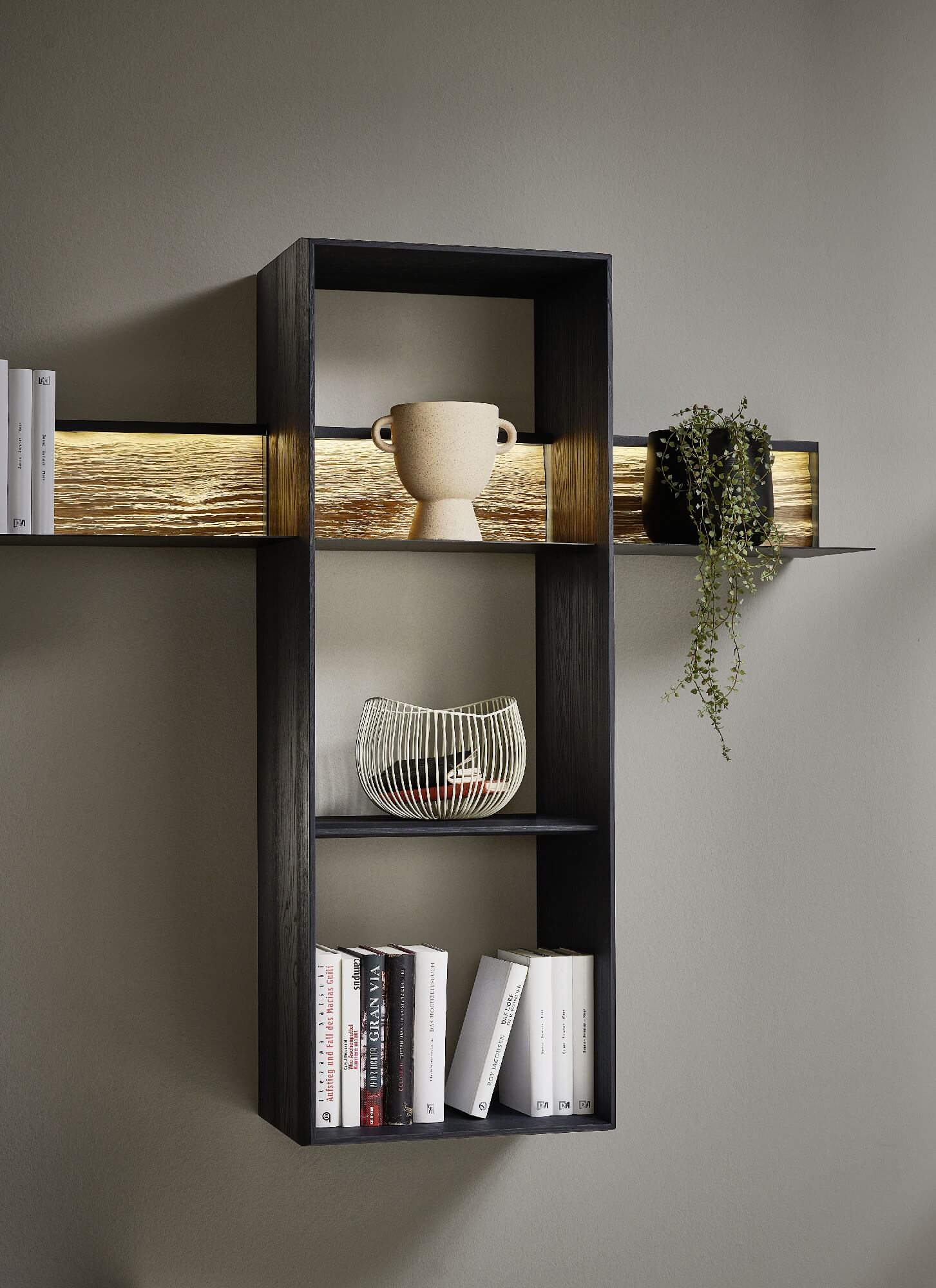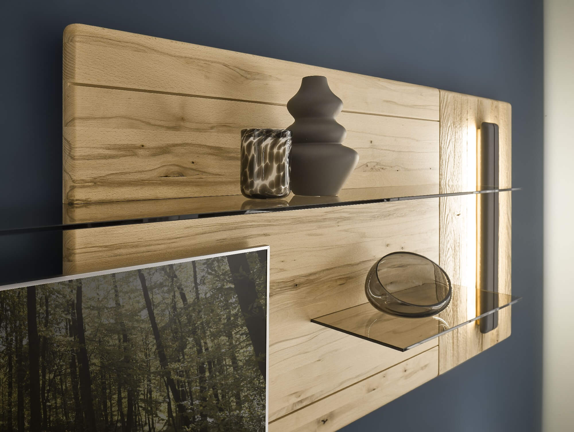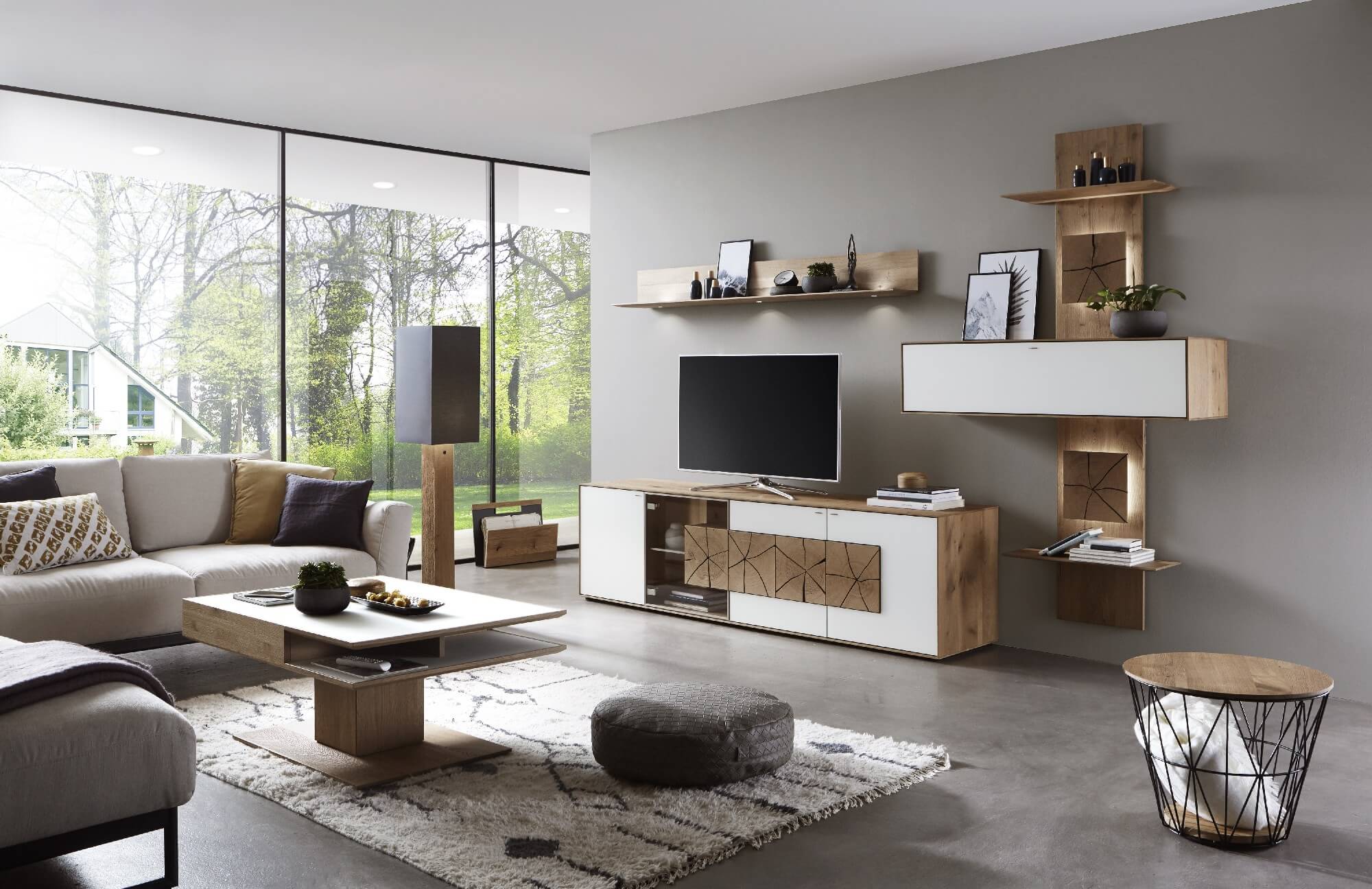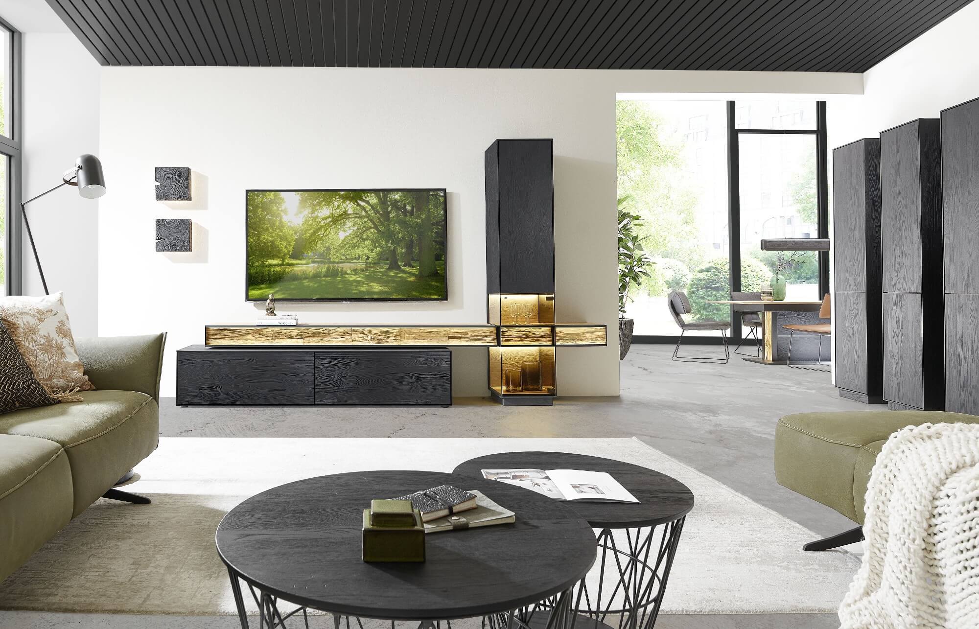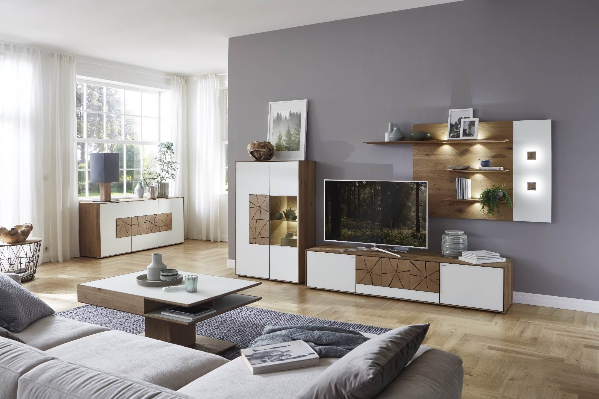Mit dem Materialmix aus dem Holz der geräucherten Kerneiche und den in Weiß und Anthrazit erhältlichen Glaselementen verschaffen Sie Ihrem Wohn- bereich ein ausgleichendes und beruhigendes Ambiente. Die indirekte Beleuchtung setzt Ihre Möbel optimal in Szene und geht mit dem Holz und den Glaselementen eine perfekte Harmonie ein.