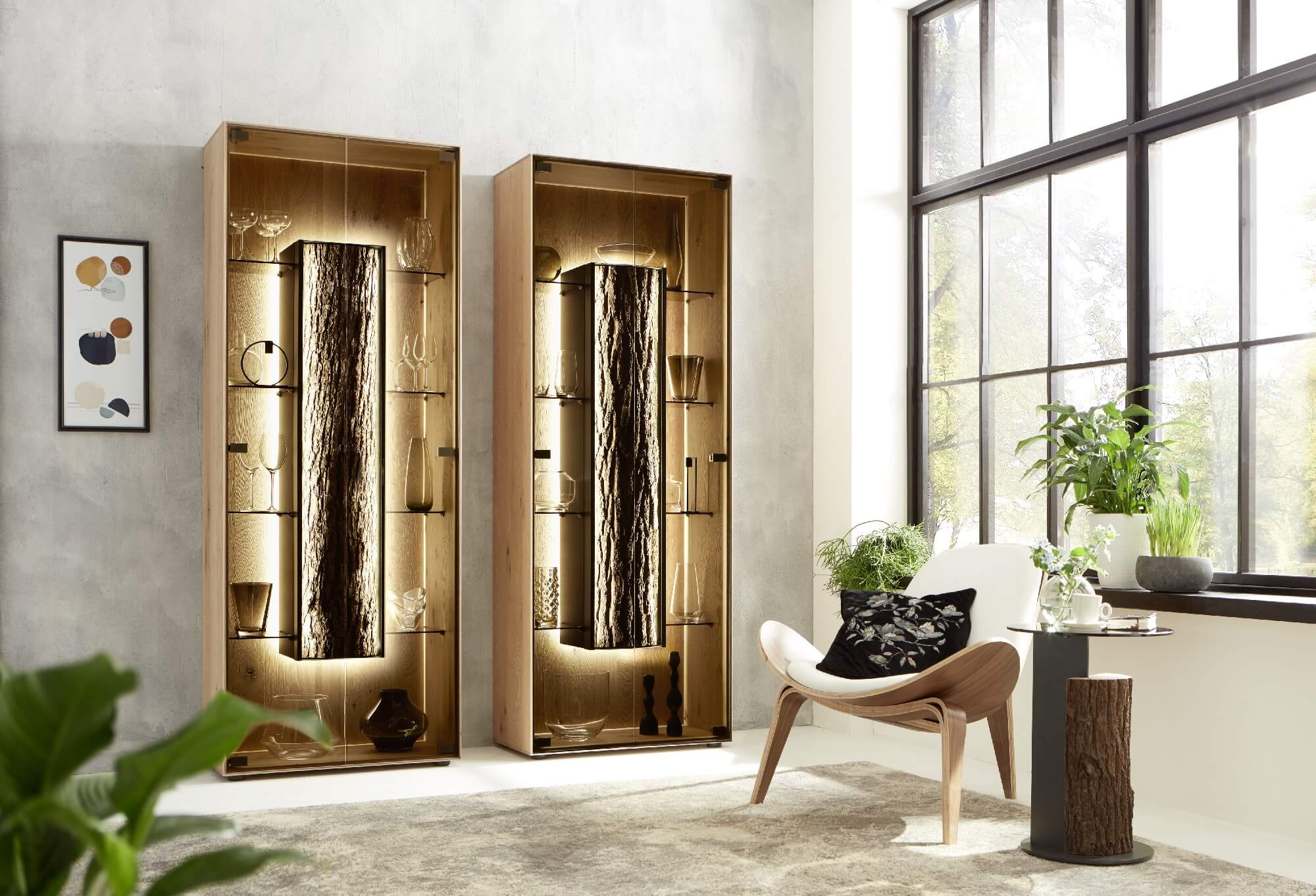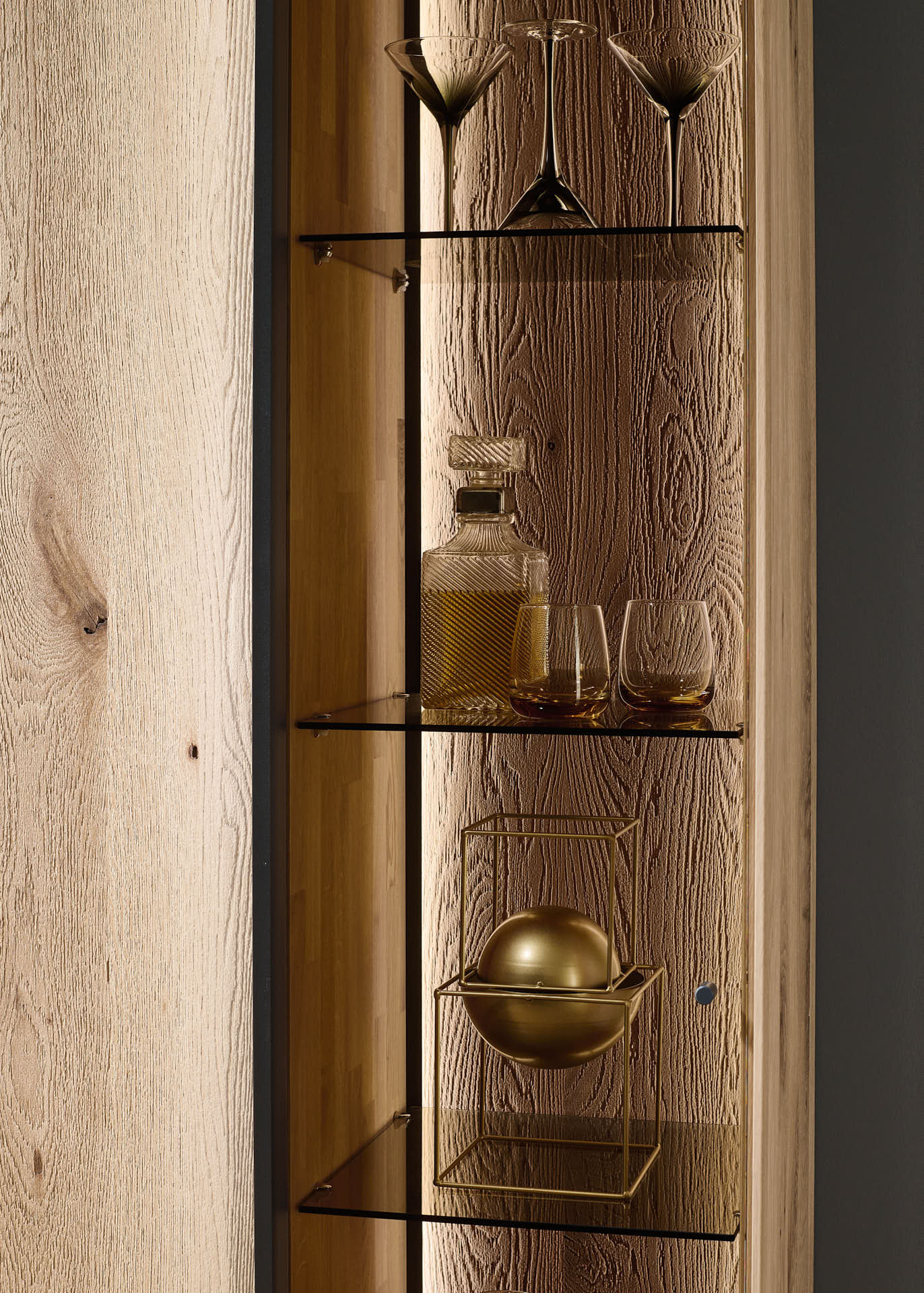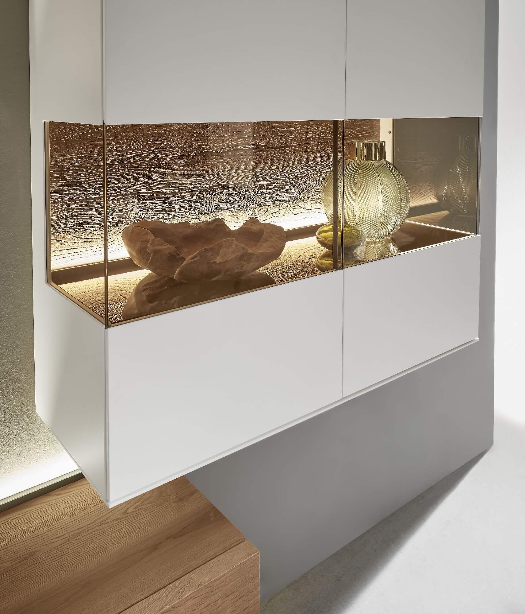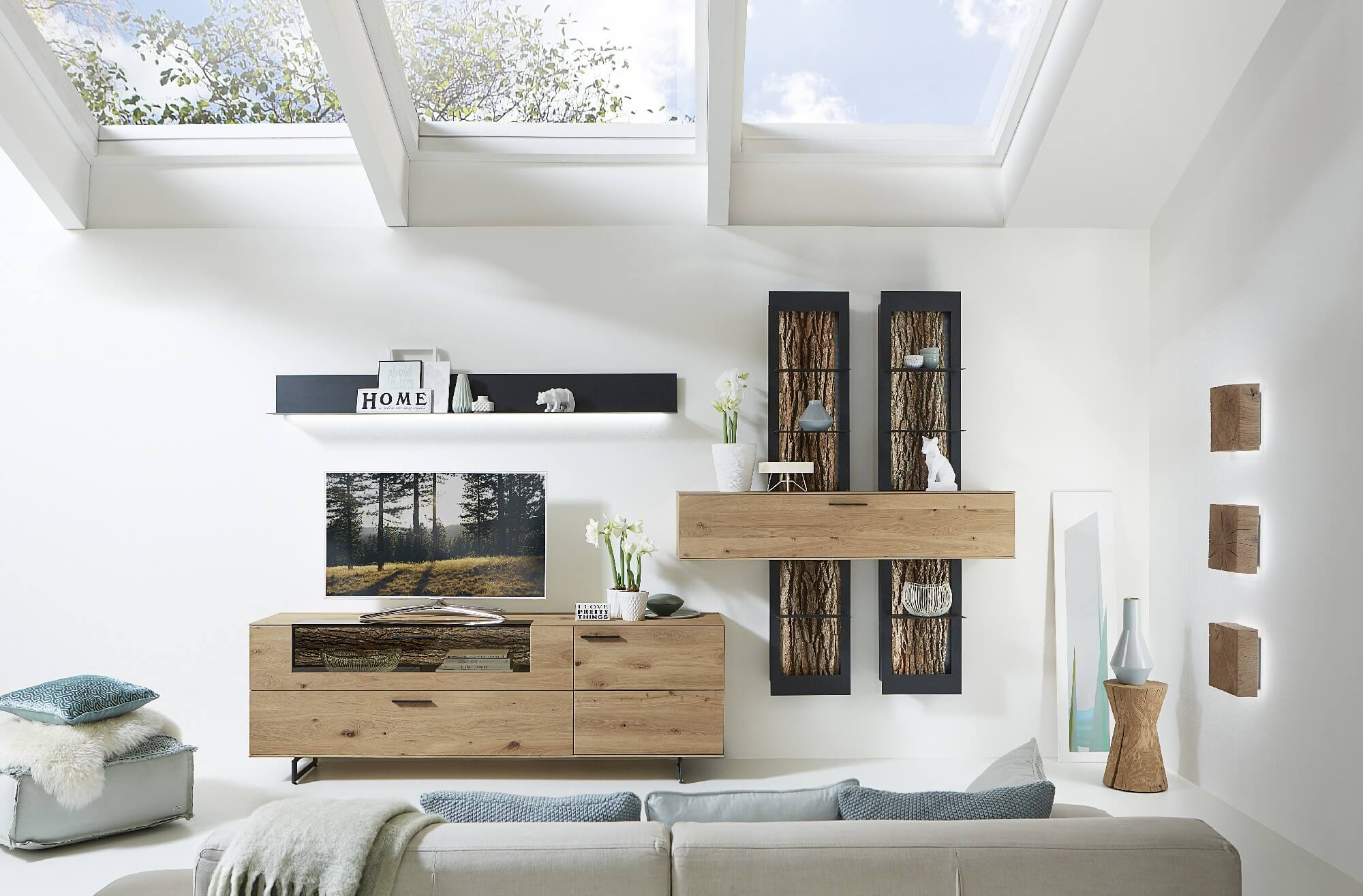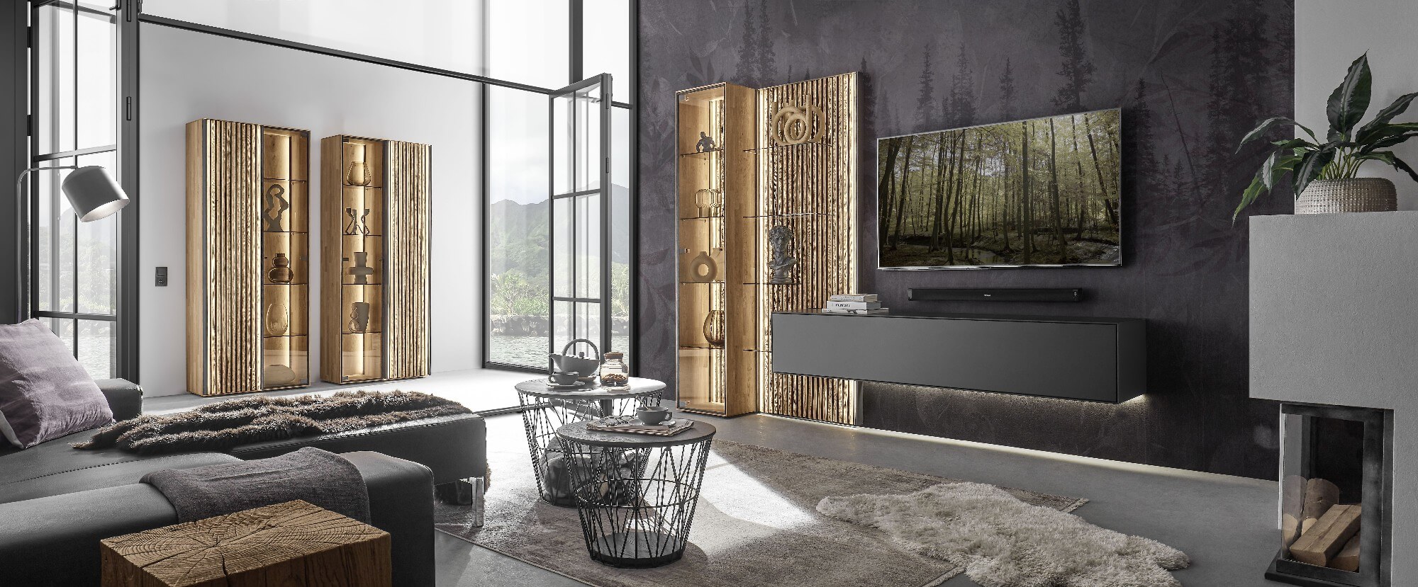 Mit dem Materialmix aus dem Holz der geräucherten Kerneiche und den in Weiß und Anthrazit erhältlichen Glaselementen verschaffen Sie Ihrem Wohn- bereich ein ausgleichendes und beruhigendes Ambiente. Die indirekte Beleuchtung setzt Ihre Möbel optimal in Szene und geht mit dem Holz und den Glaselementen eine perfekte Harmonie ein.