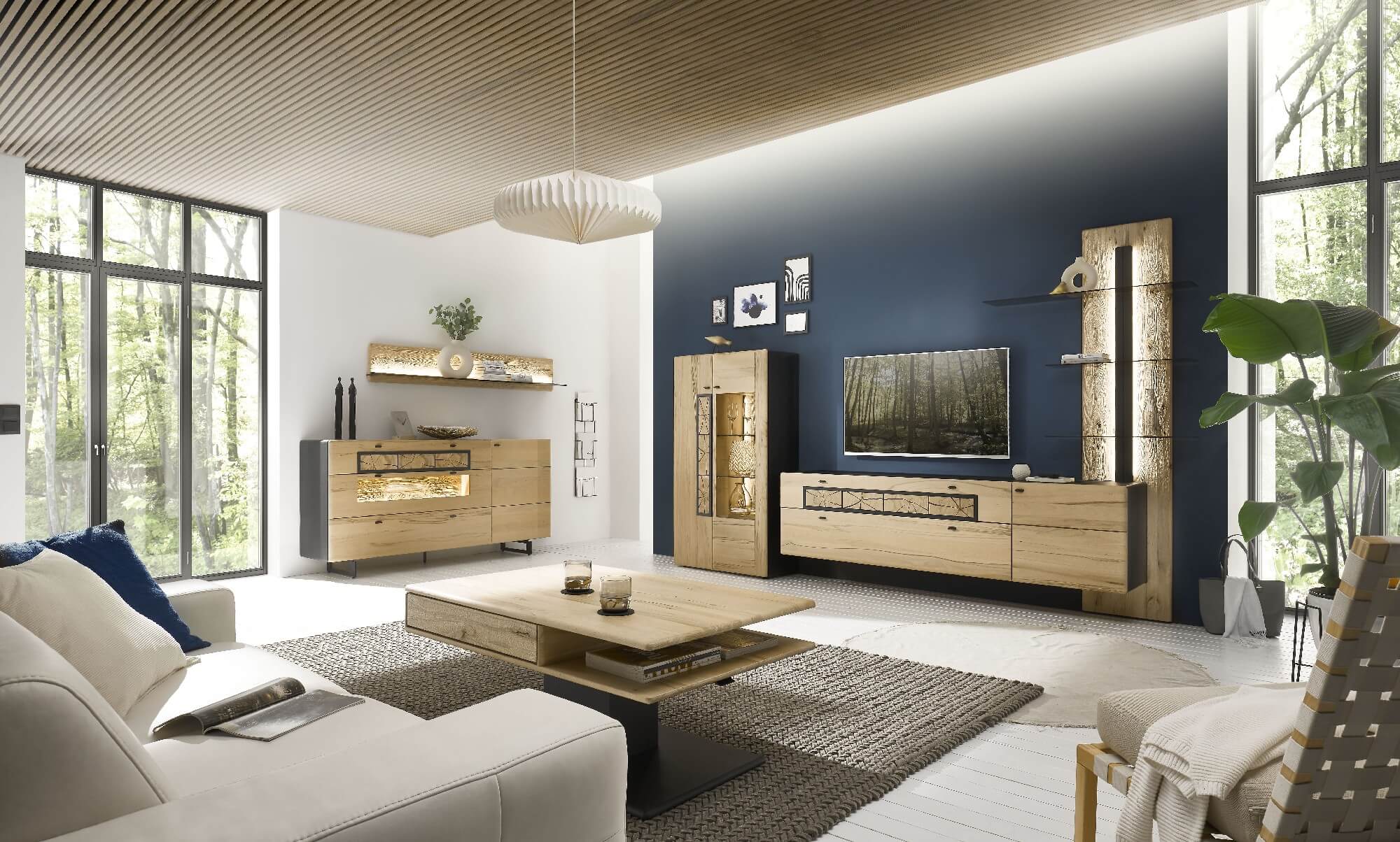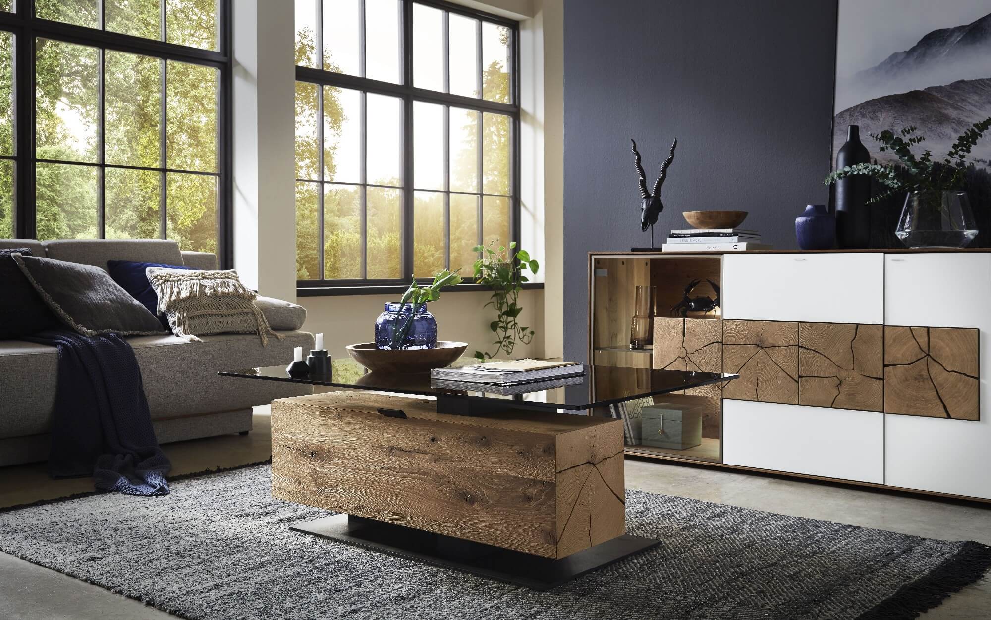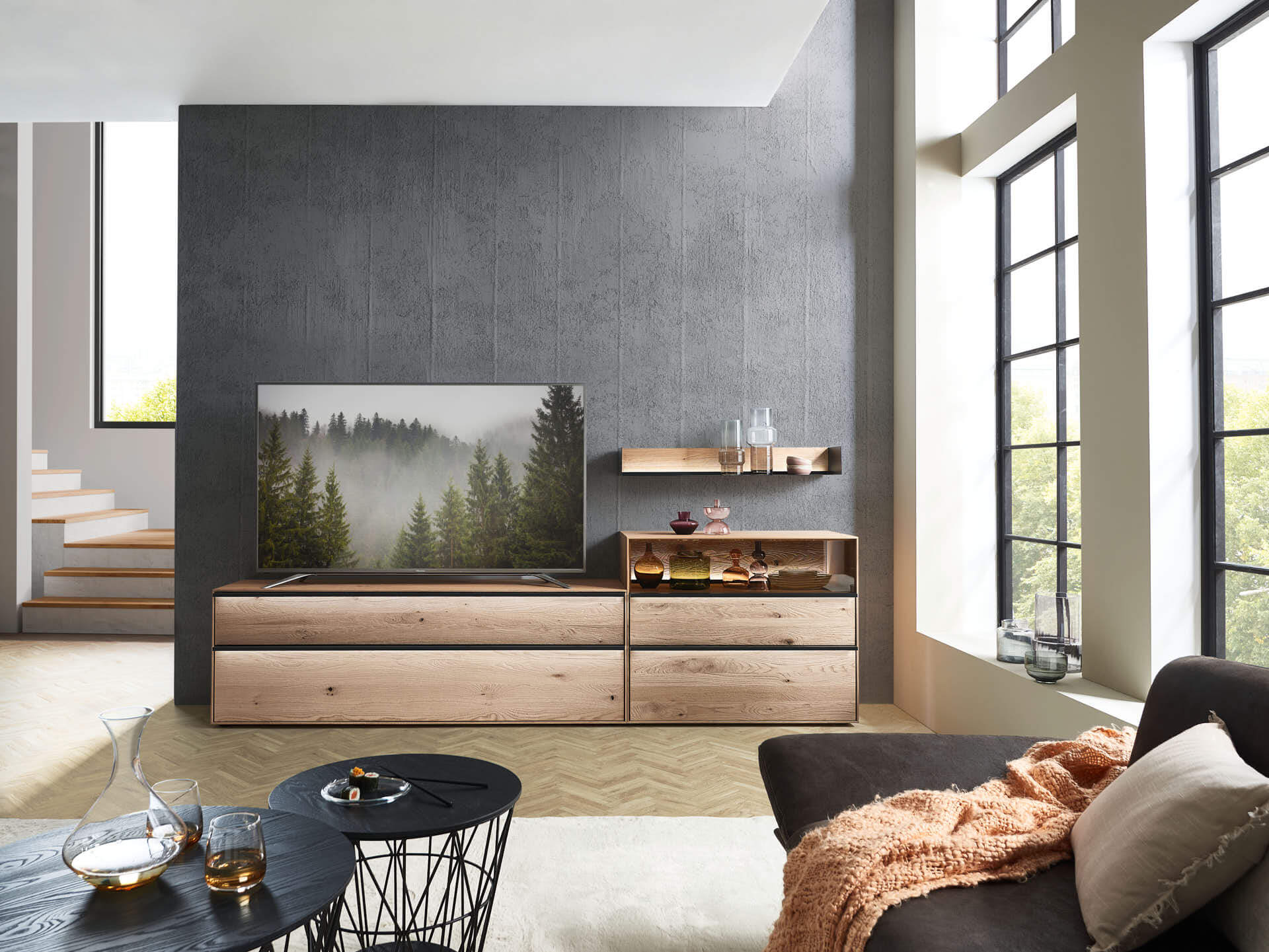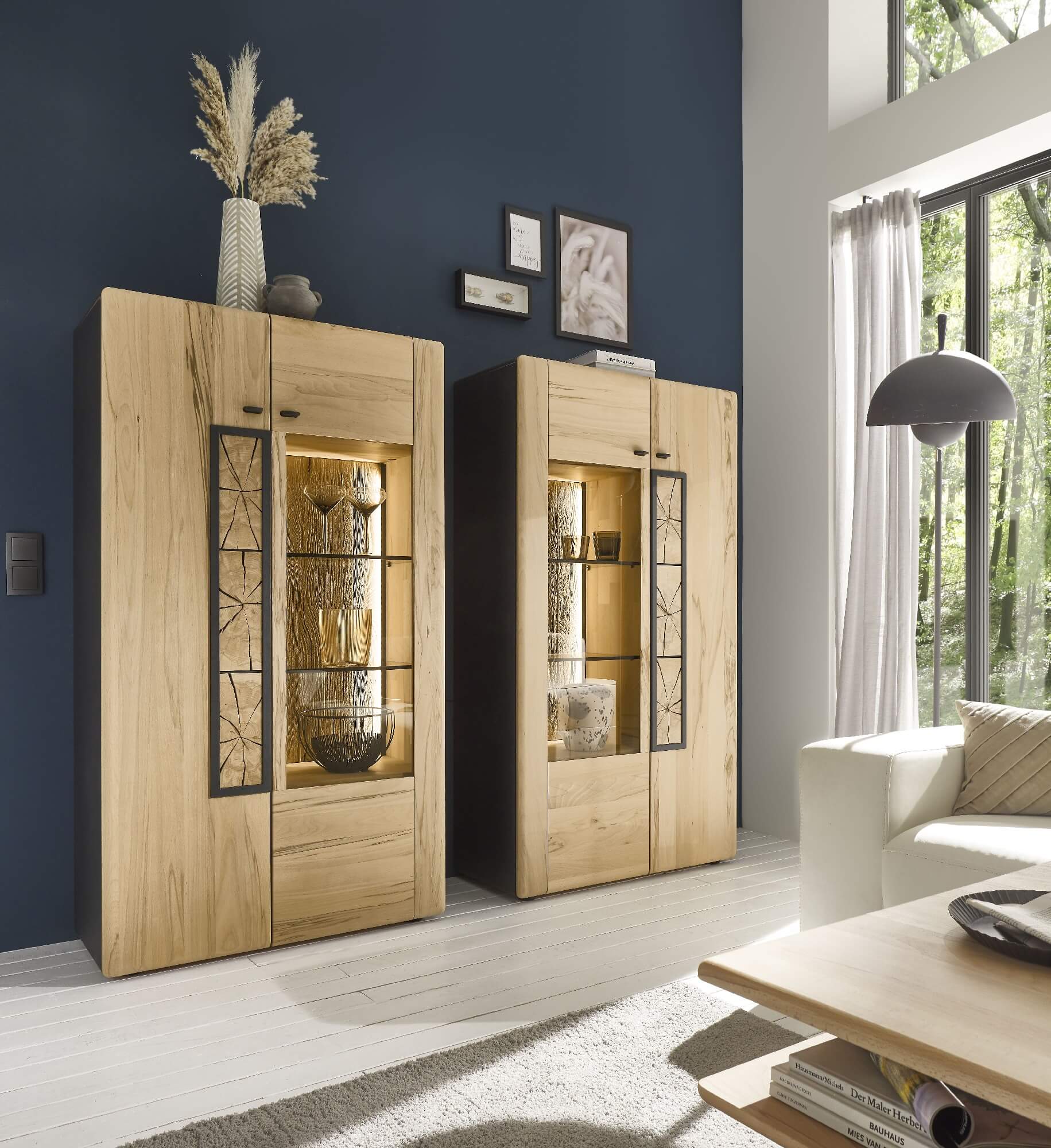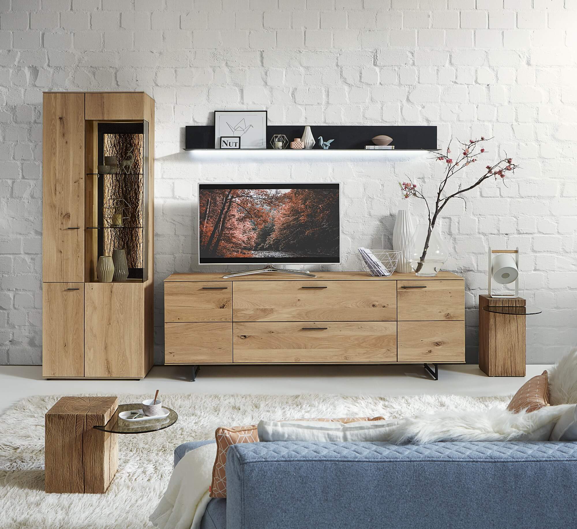 Mit dem Materialmix aus dem Holz der geräucherten Kerneiche und den in Weiß und Anthrazit erhältlichen Glaselementen verschaffen Sie Ihrem Wohn- bereich ein ausgleichendes und beruhigendes Ambiente. Die indirekte Beleuchtung setzt Ihre Möbel optimal in Szene und geht mit dem Holz und den Glaselementen eine perfekte Harmonie ein.