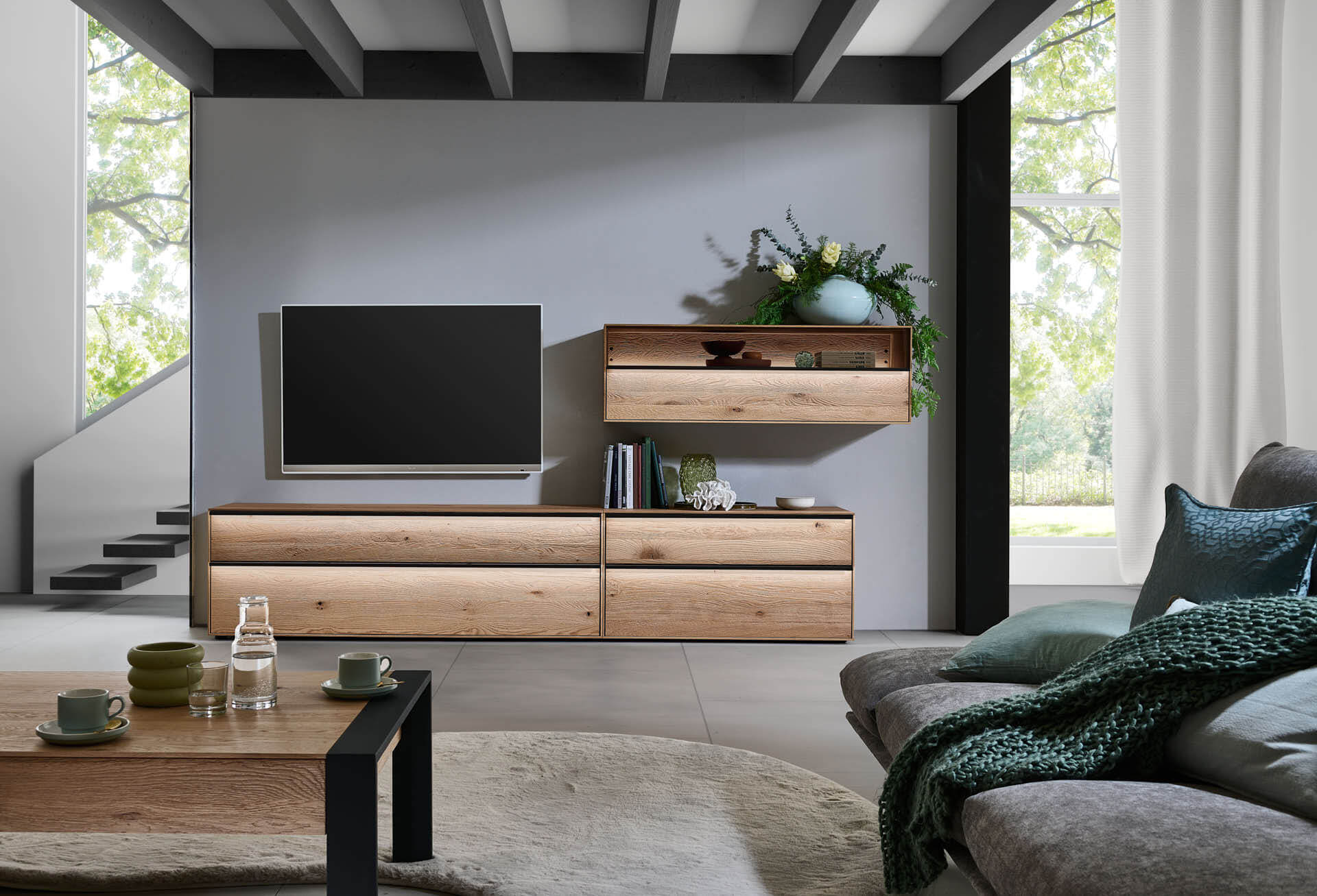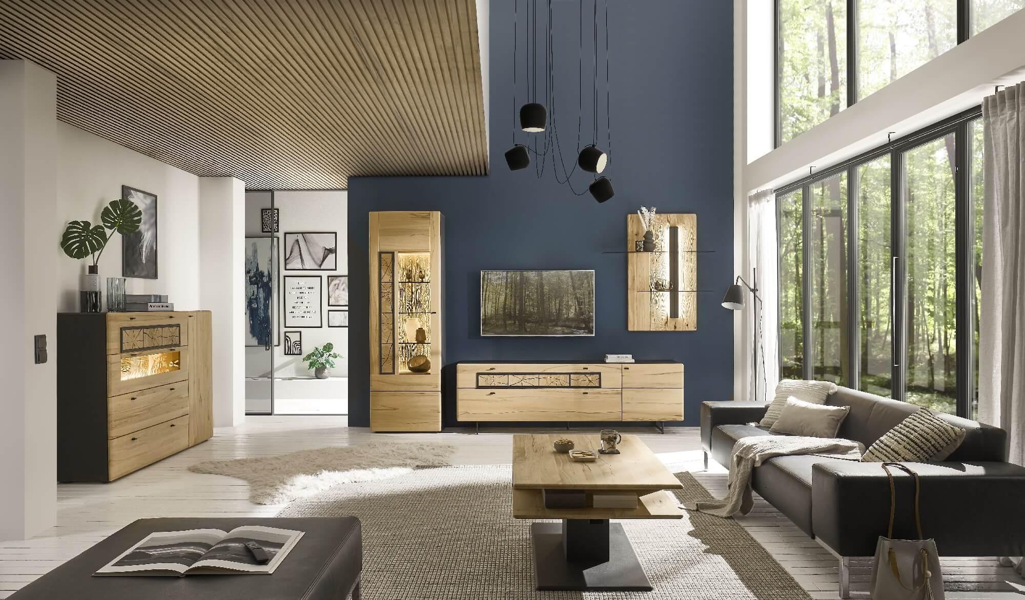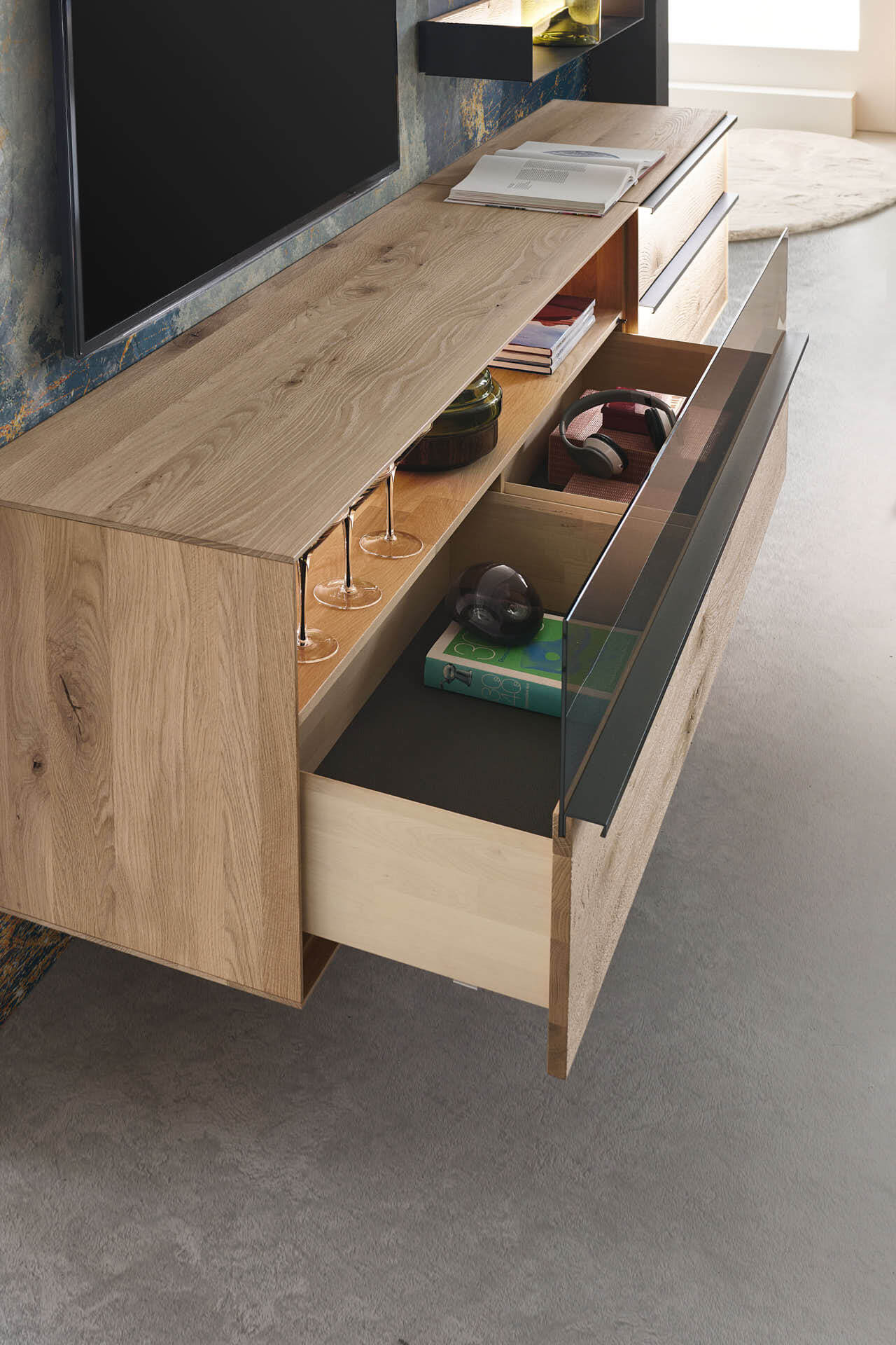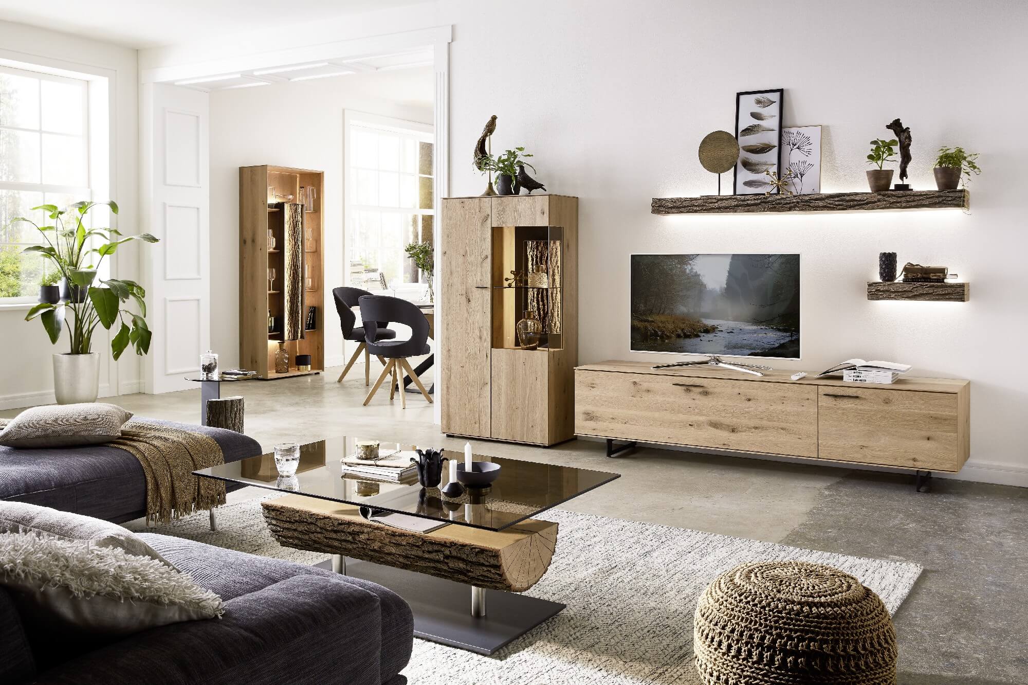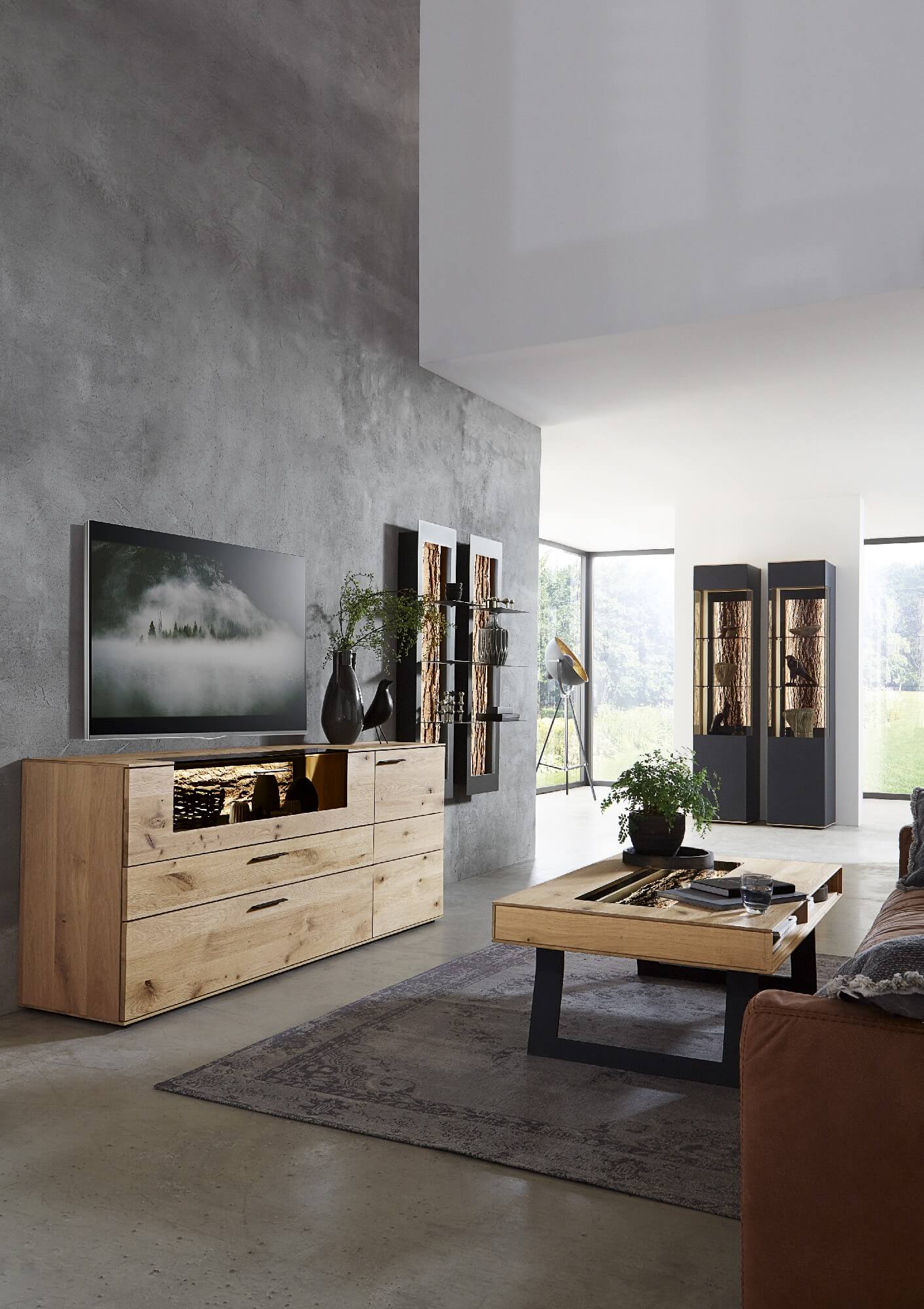 Mit dem Materialmix aus dem Holz der geräucherten Kerneiche und den in Weiß und Anthrazit erhältlichen Glaselementen verschaffen Sie Ihrem Wohn- bereich ein ausgleichendes und beruhigendes Ambiente. Die indirekte Beleuchtung setzt Ihre Möbel optimal in Szene und geht mit dem Holz und den Glaselementen eine perfekte Harmonie ein.