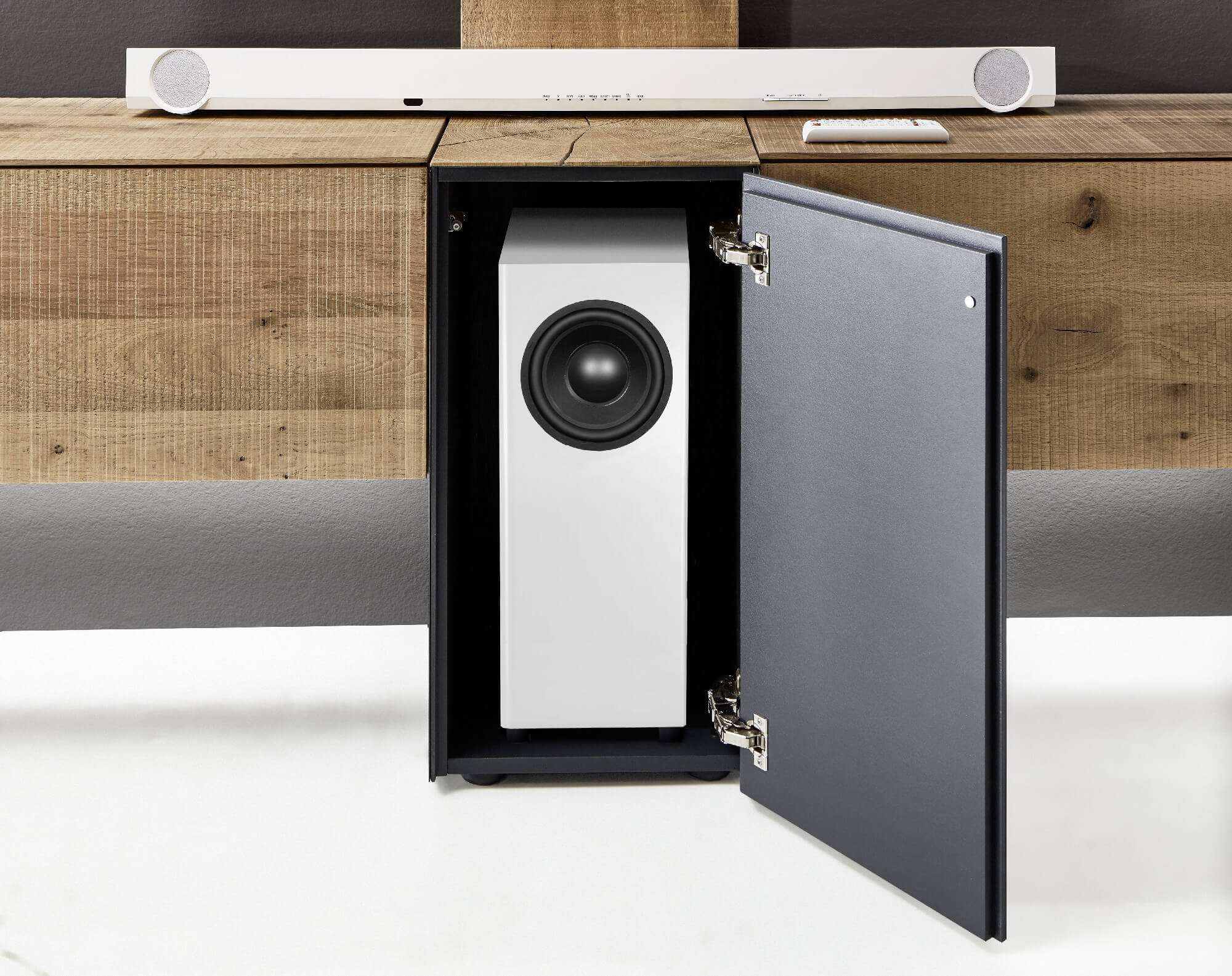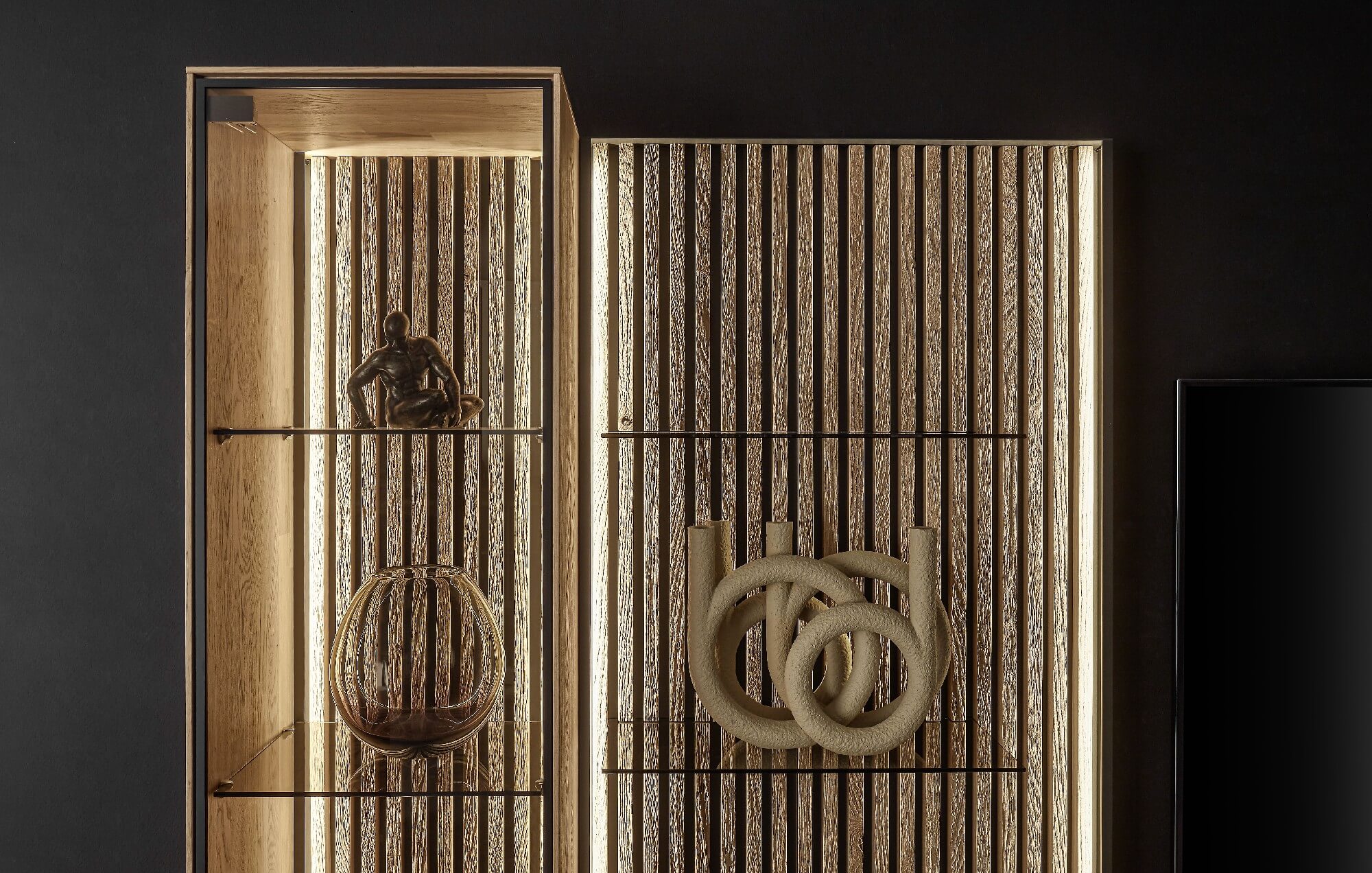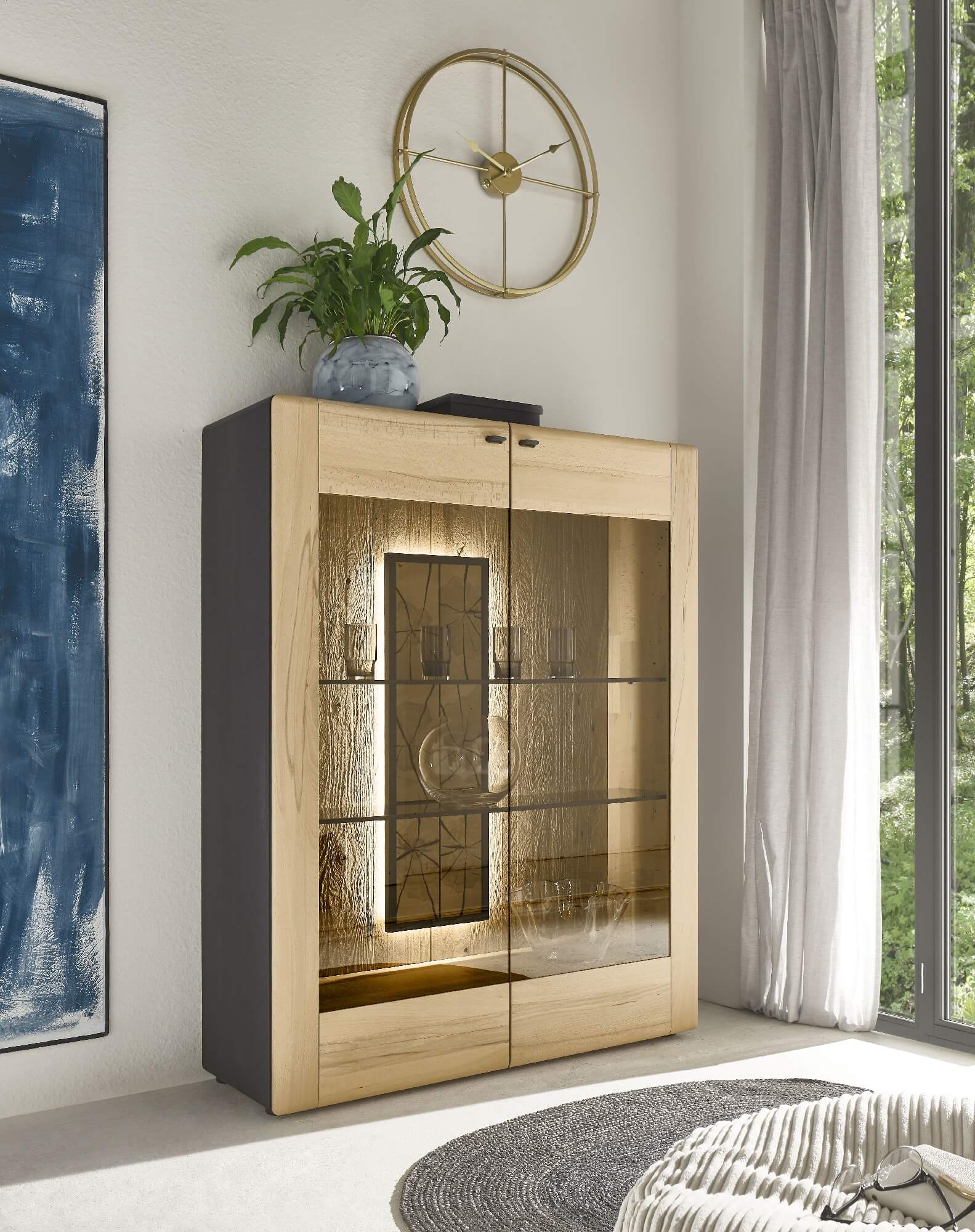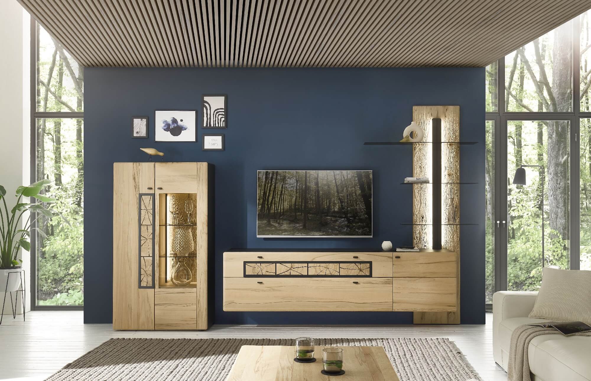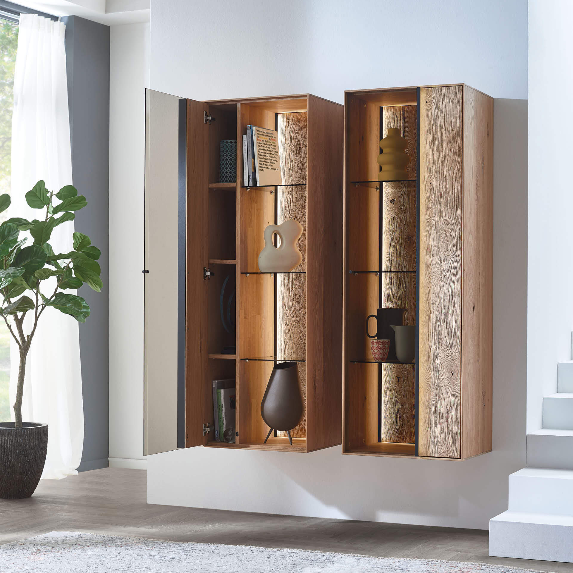 Mit dem Materialmix aus dem Holz der geräucherten Kerneiche und den in Weiß und Anthrazit erhältlichen Glaselementen verschaffen Sie Ihrem Wohn- bereich ein ausgleichendes und beruhigendes Ambiente. Die indirekte Beleuchtung setzt Ihre Möbel optimal in Szene und geht mit dem Holz und den Glaselementen eine perfekte Harmonie ein.