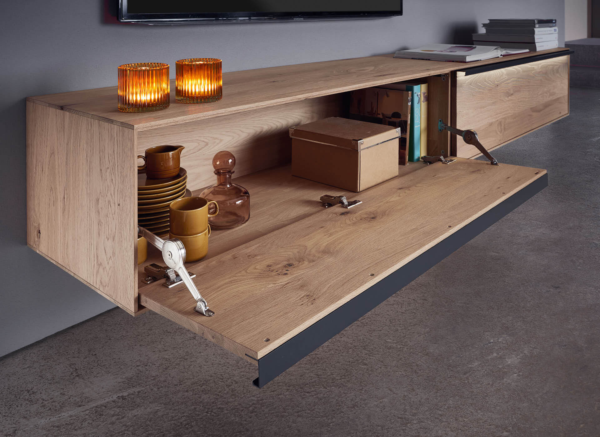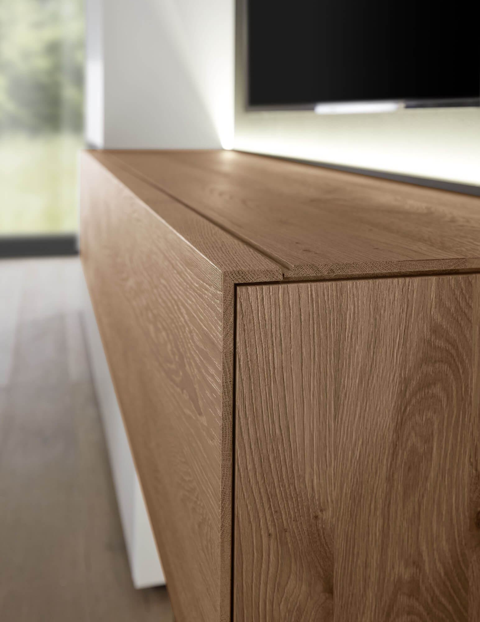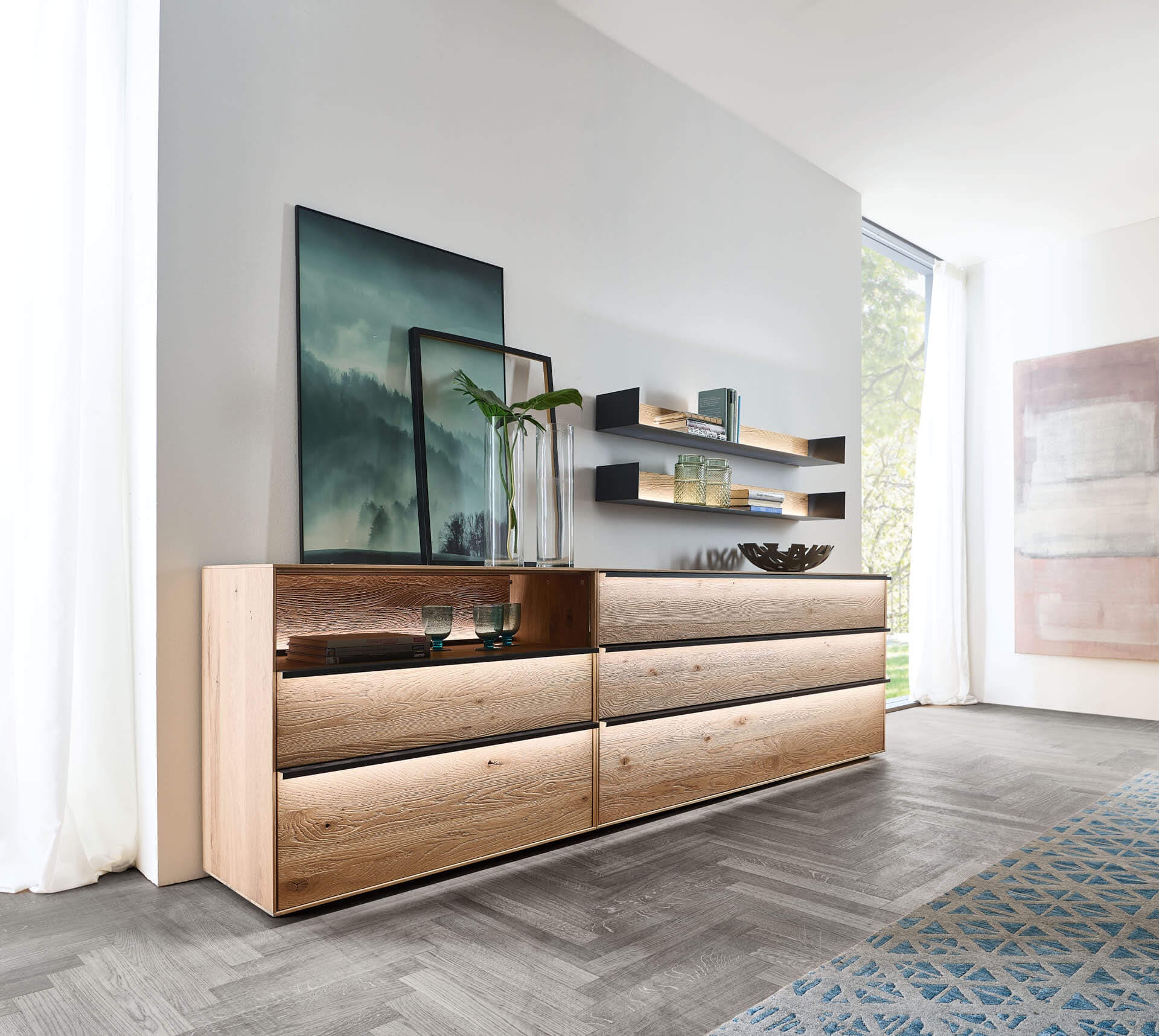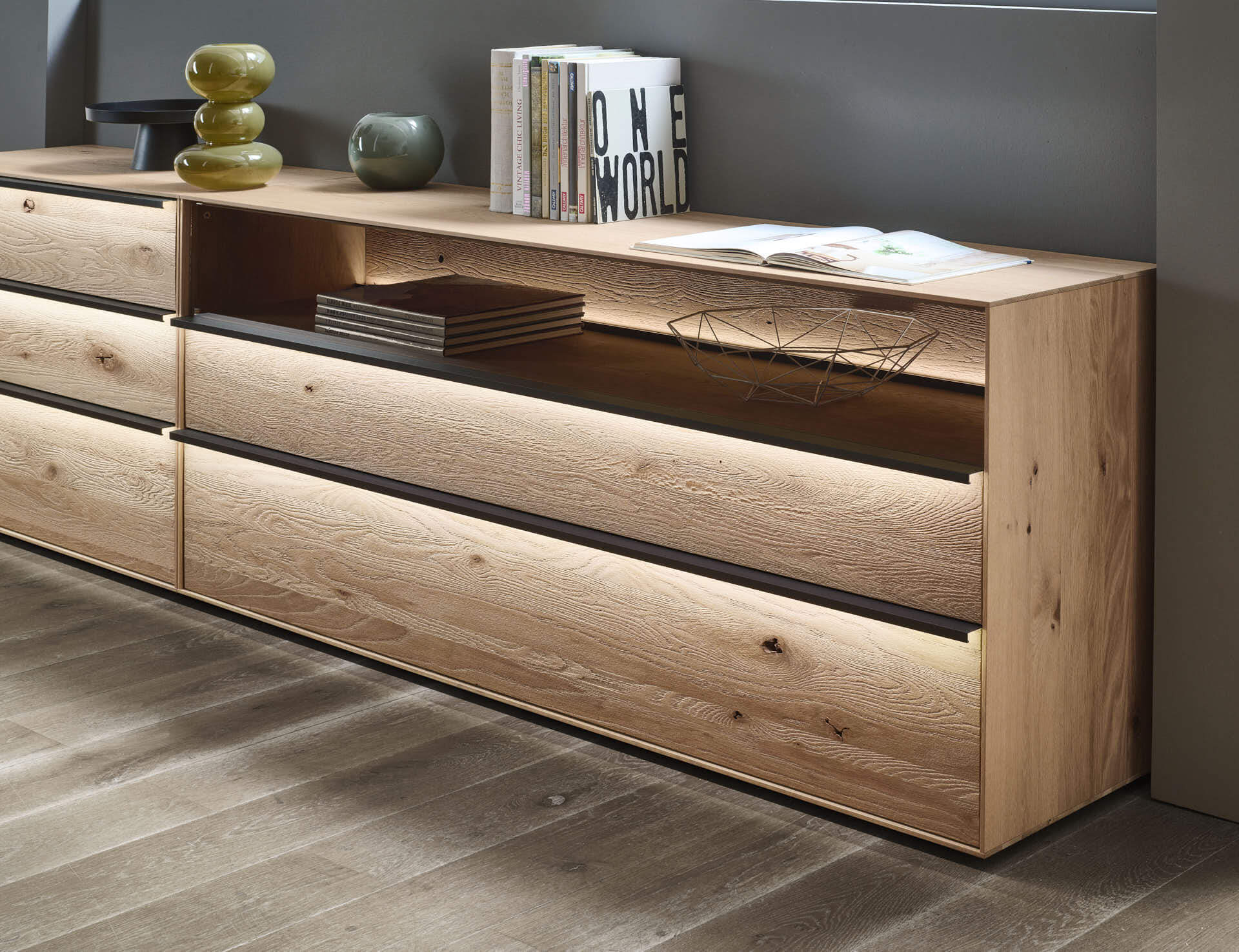 Aus dem edlen Materialmix aus Lack und dem Massivholz der sägerau gebürsteten Kerneiche Umato ergibt sich eine einzigartige Spannung, die Sie spüren werden. Low-, Side- und Highboards können Sie sowohl bodenstehend als auch auf einem beleuchteten Sockel stehend in Szene setzen.
