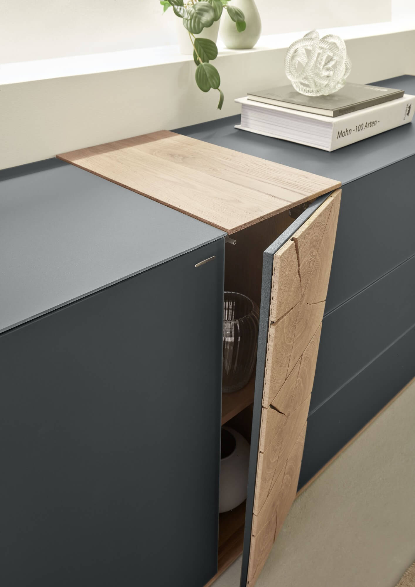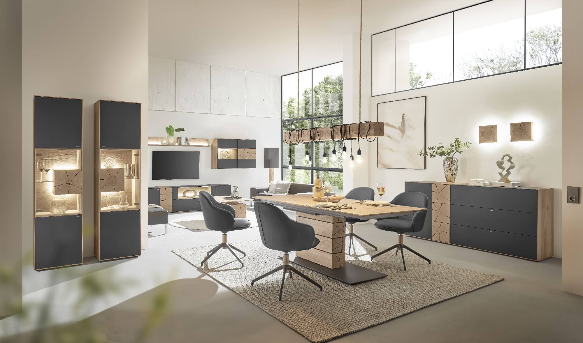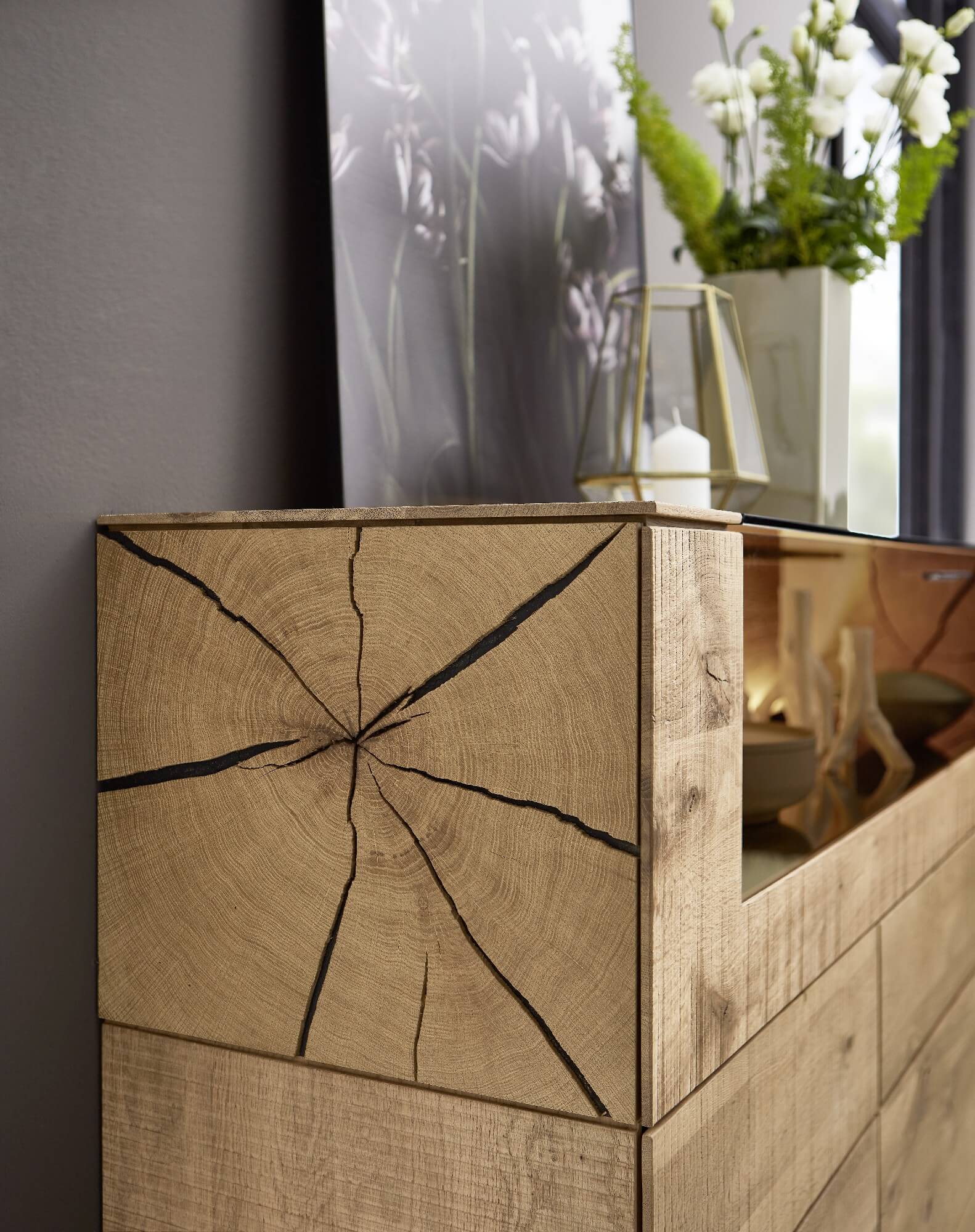 Bei Kilva wurden zwei besondere Holzarten miteinander verheiratet, um einen harmonischen Kontrast zu schaffen: anthrazit gebeiztes Eschenholz trifft hier auf Kerneiche Natur. Kilvas Herzstück bilden dabei die Spaltholz-Applikationen.