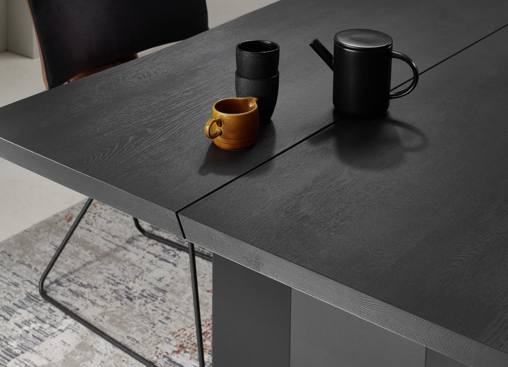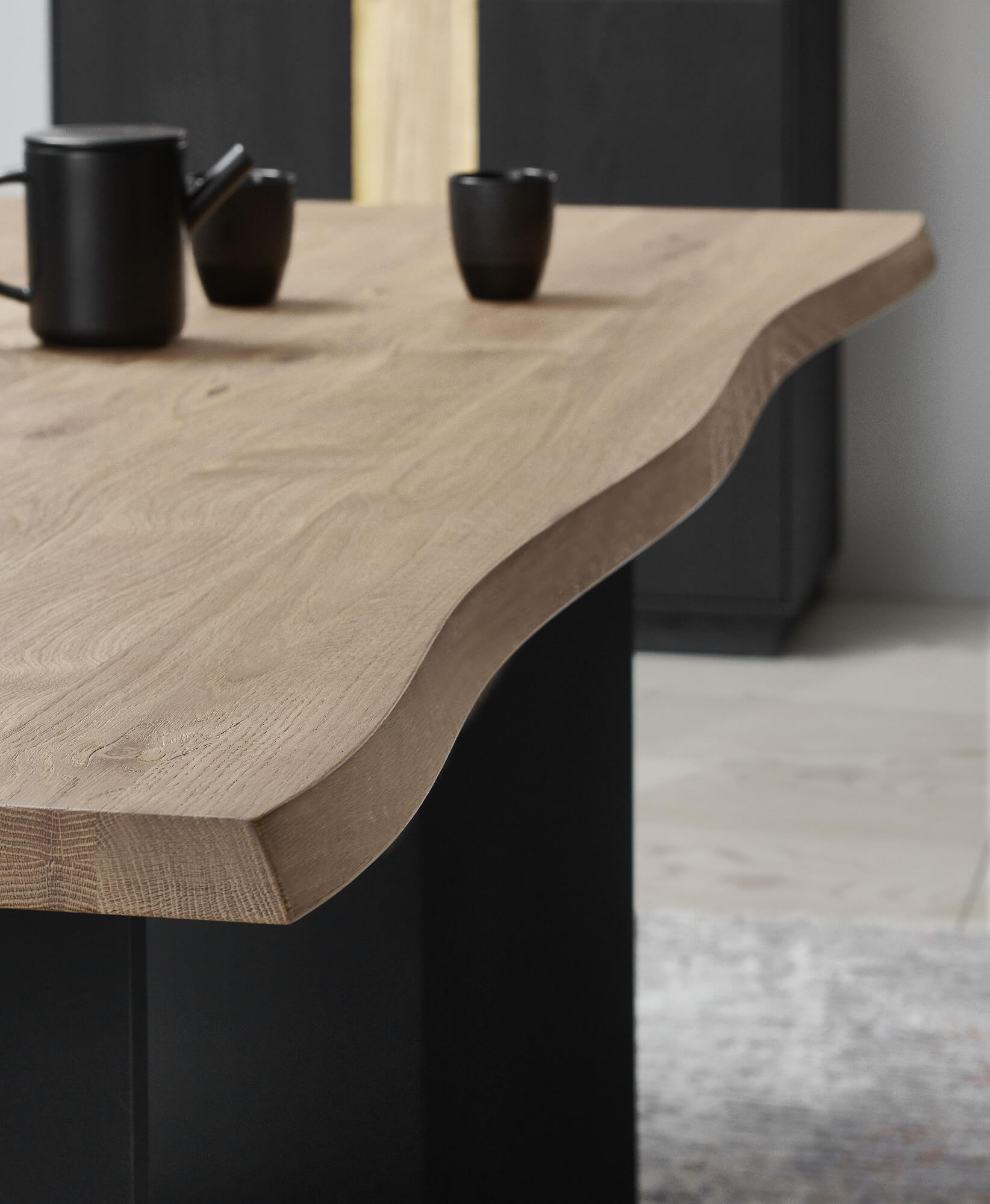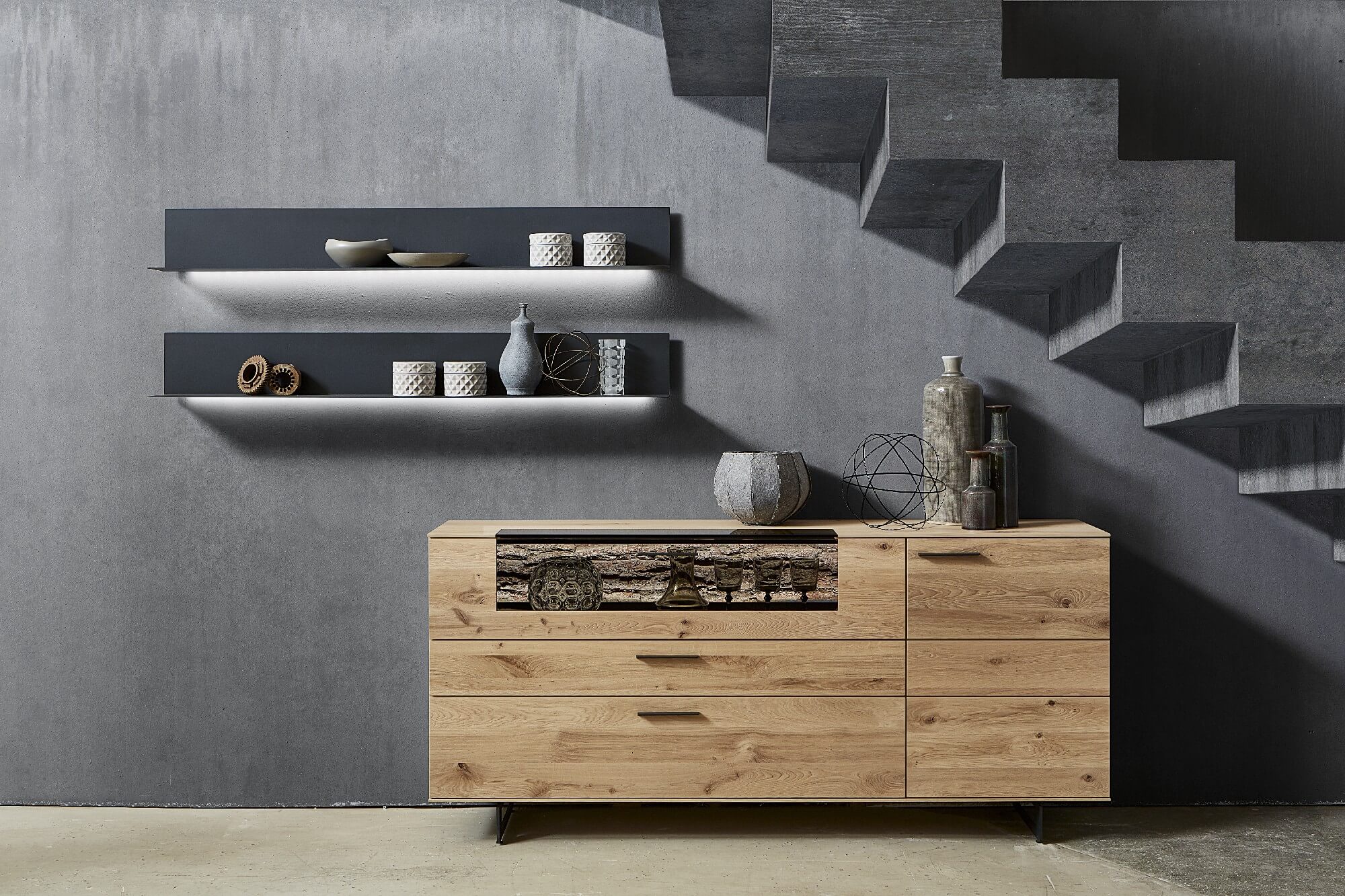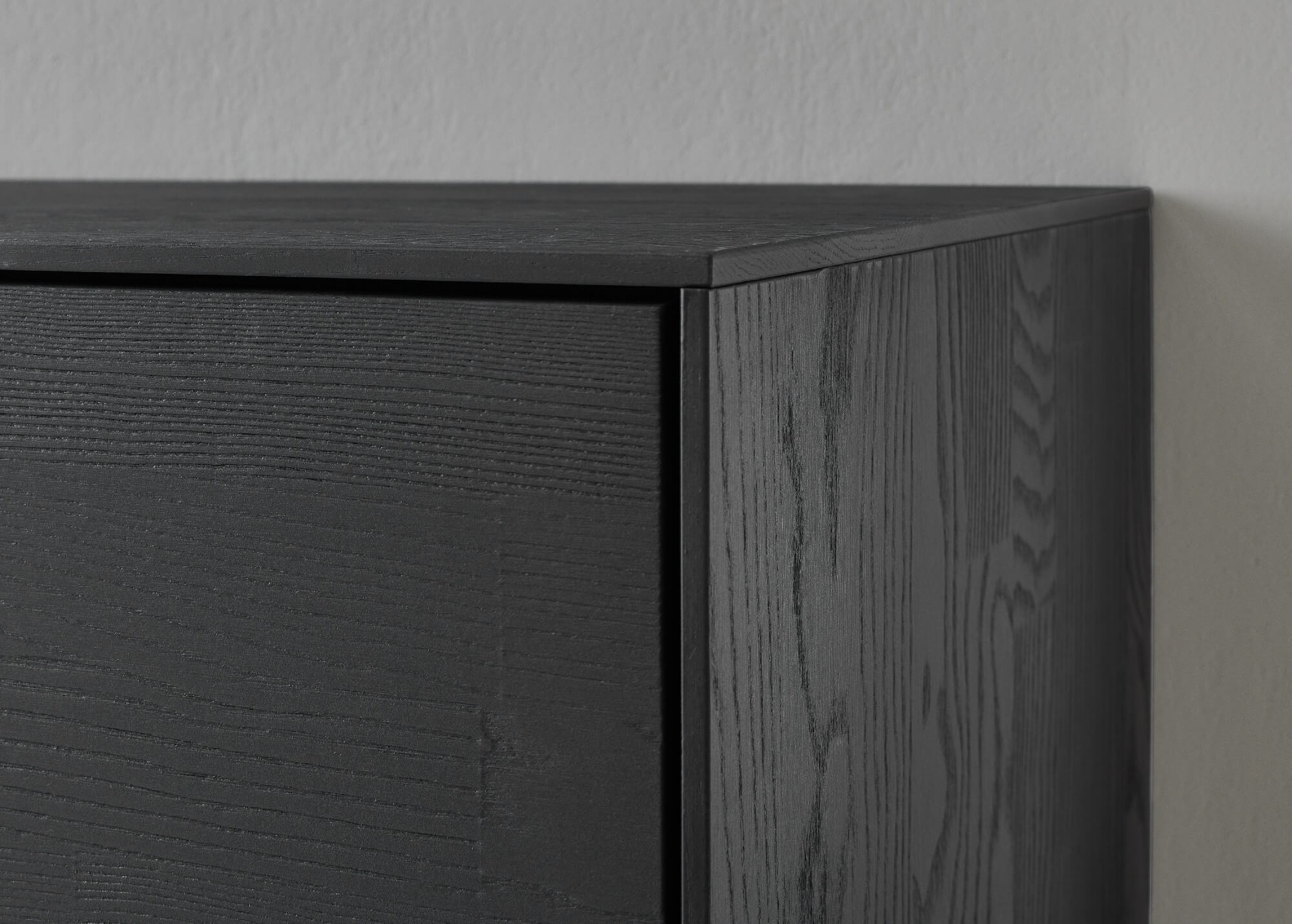 Bei Kilva wurden zwei besondere Holzarten miteinander verheiratet, um einen harmonischen Kontrast zu schaffen: anthrazit gebeiztes Eschenholz trifft hier auf Kerneiche Natur. Kilvas Herzstück bilden dabei die Spaltholz-Applikationen.