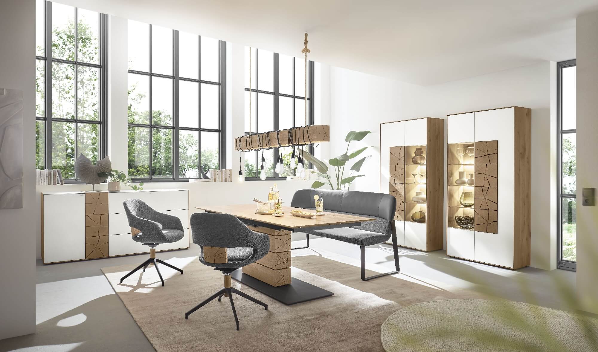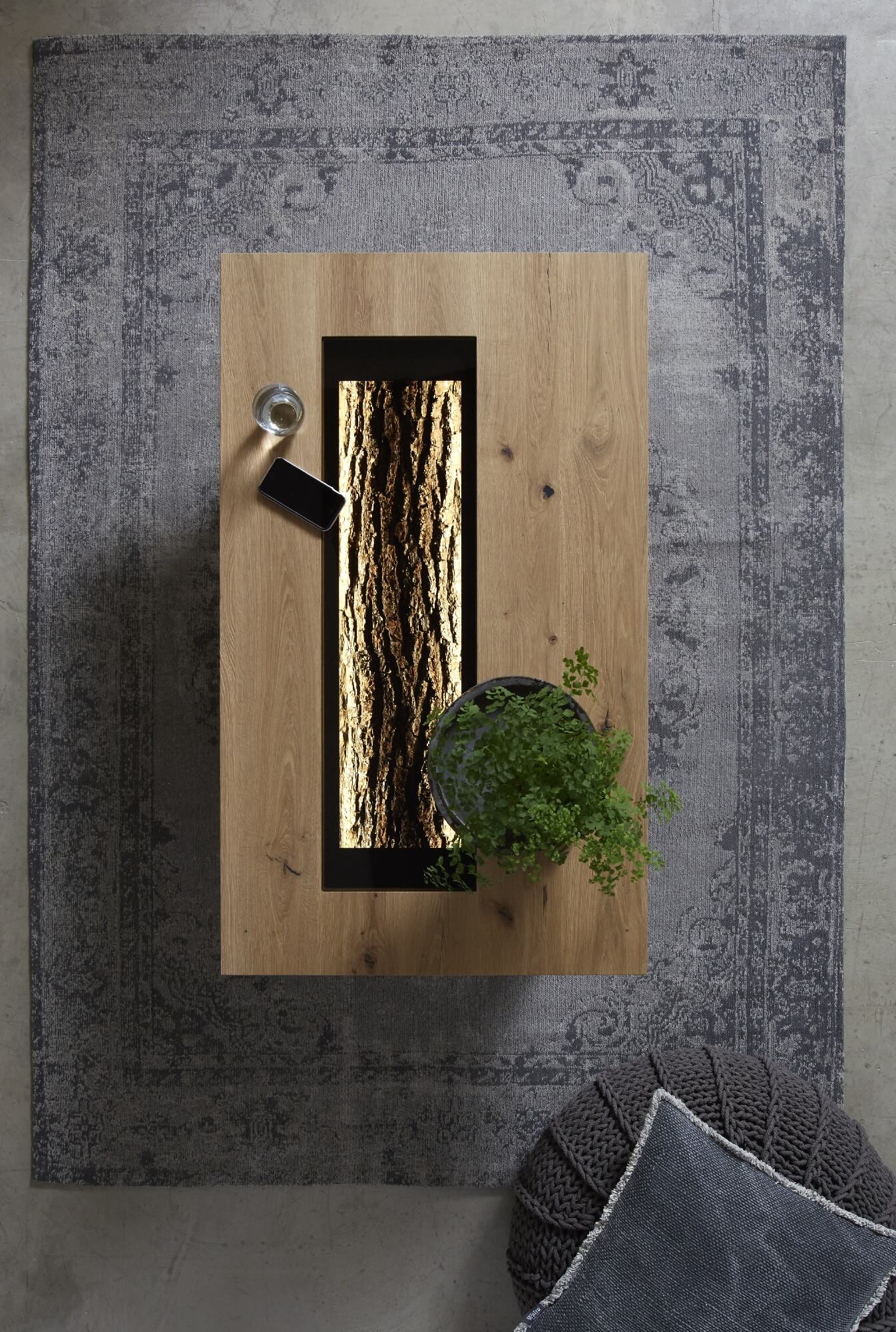 Die Rinde verleiht dem Programm einen einzigartigen, natürlichen Look und sorgt somit für eine angenehme, ruhige Wohnatmosphäre. Das verarbeitete Massivholz Kerneiche Natur weist typische Merkmale wie Kernrisse und Flügeläste auf und unterstreicht somit den wilden, rauen Charakter der Linie. In Kombination mit kühlem Metall schafft es stilistisch eine überaus spannende Dramaturgie.