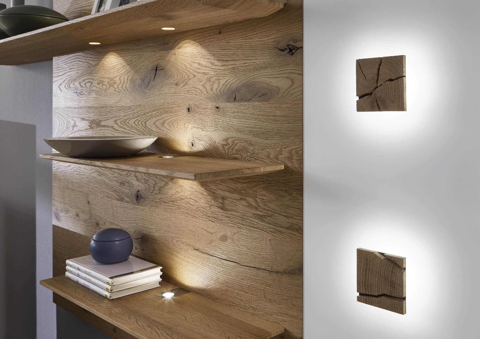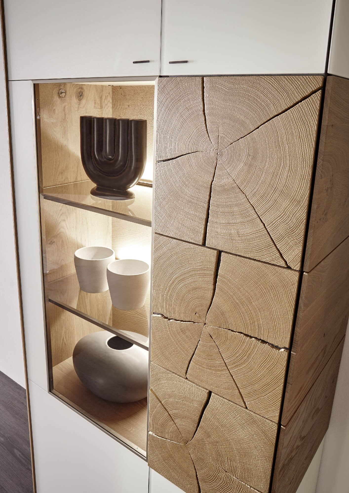 Neben massiv gebürsteter Kerneiche und matten Glas-Elementen in Weiß und Anthrazit, stehen individuelle Hirnholzscheiben im Mittelpunkt.
