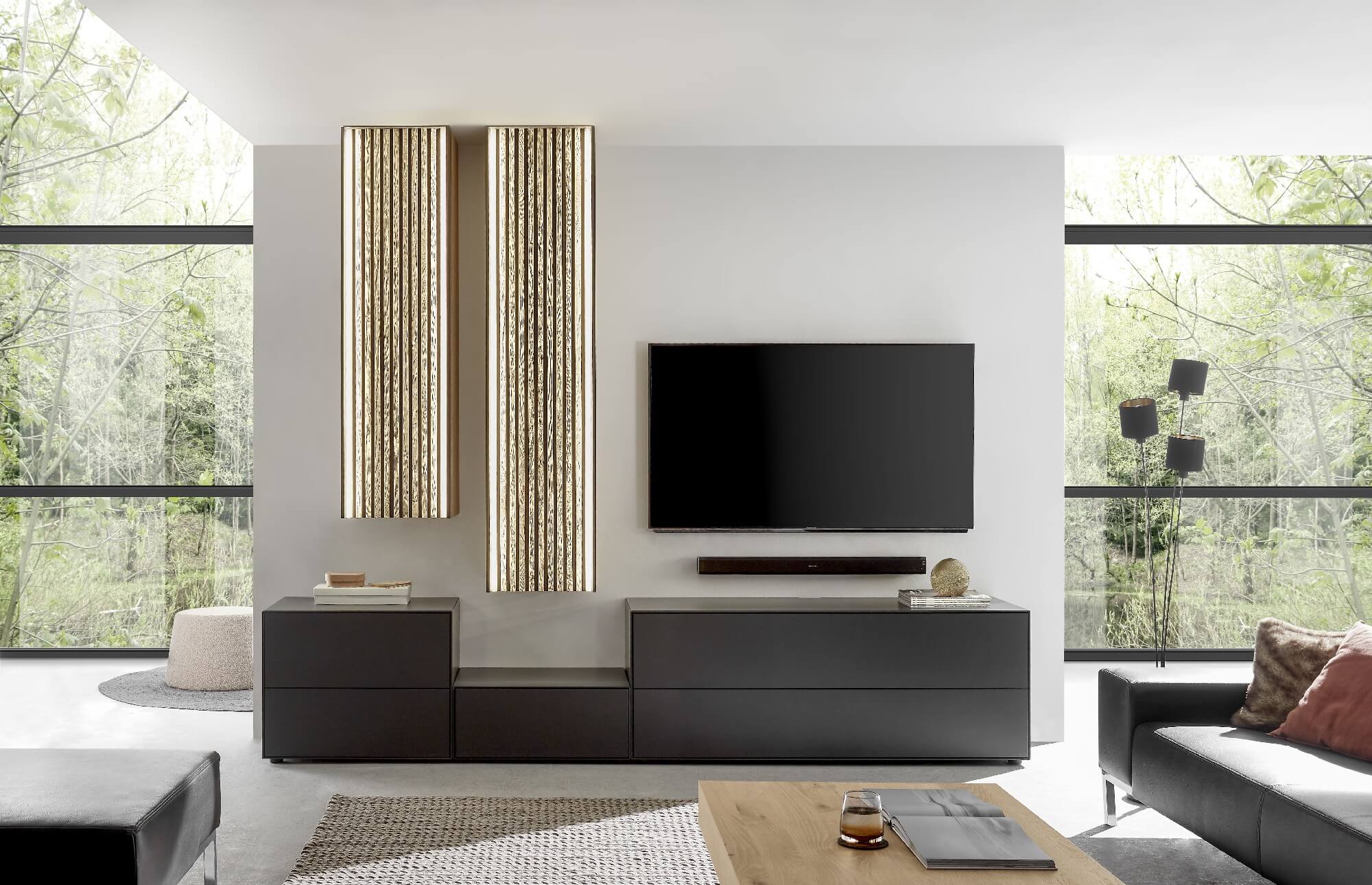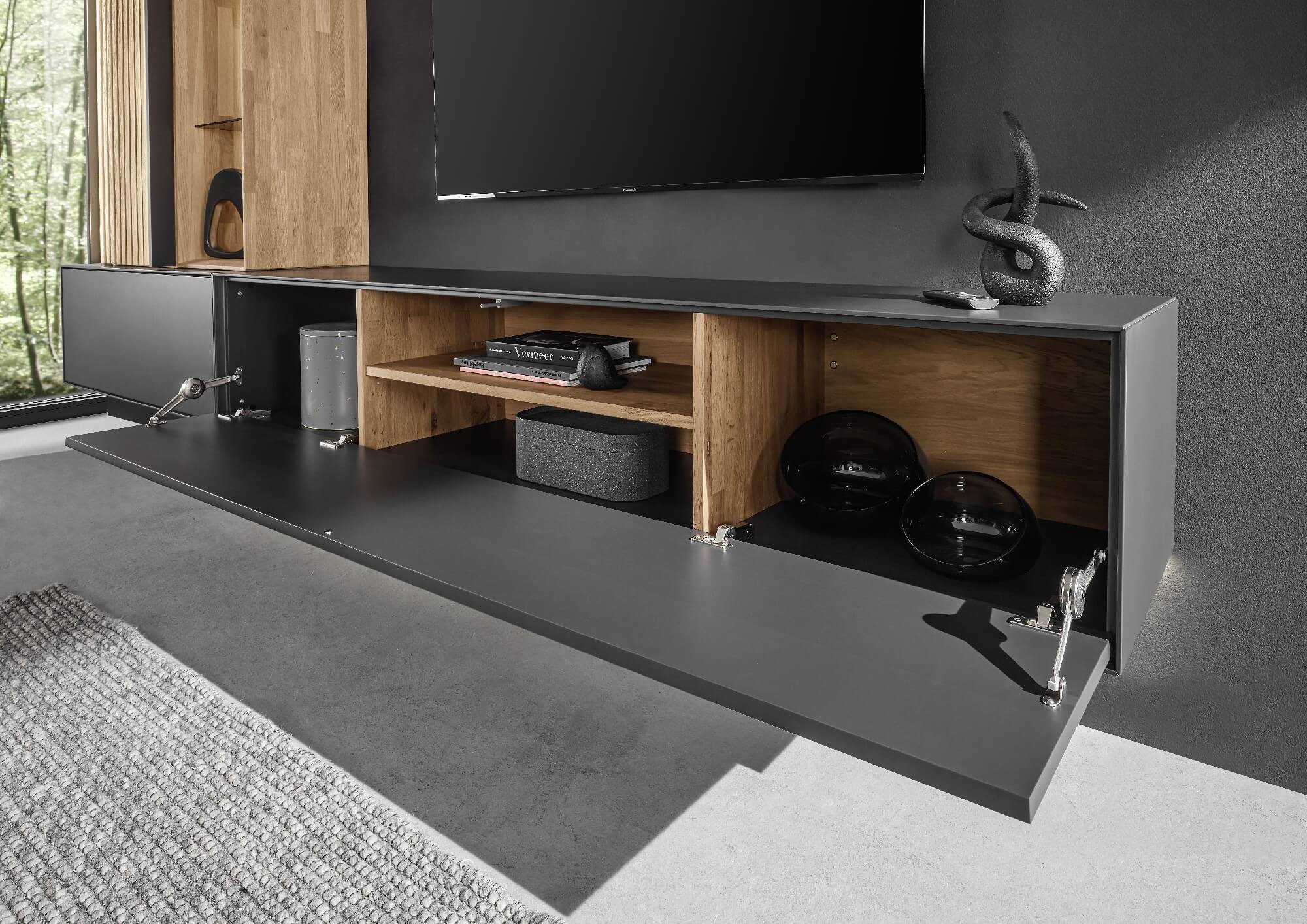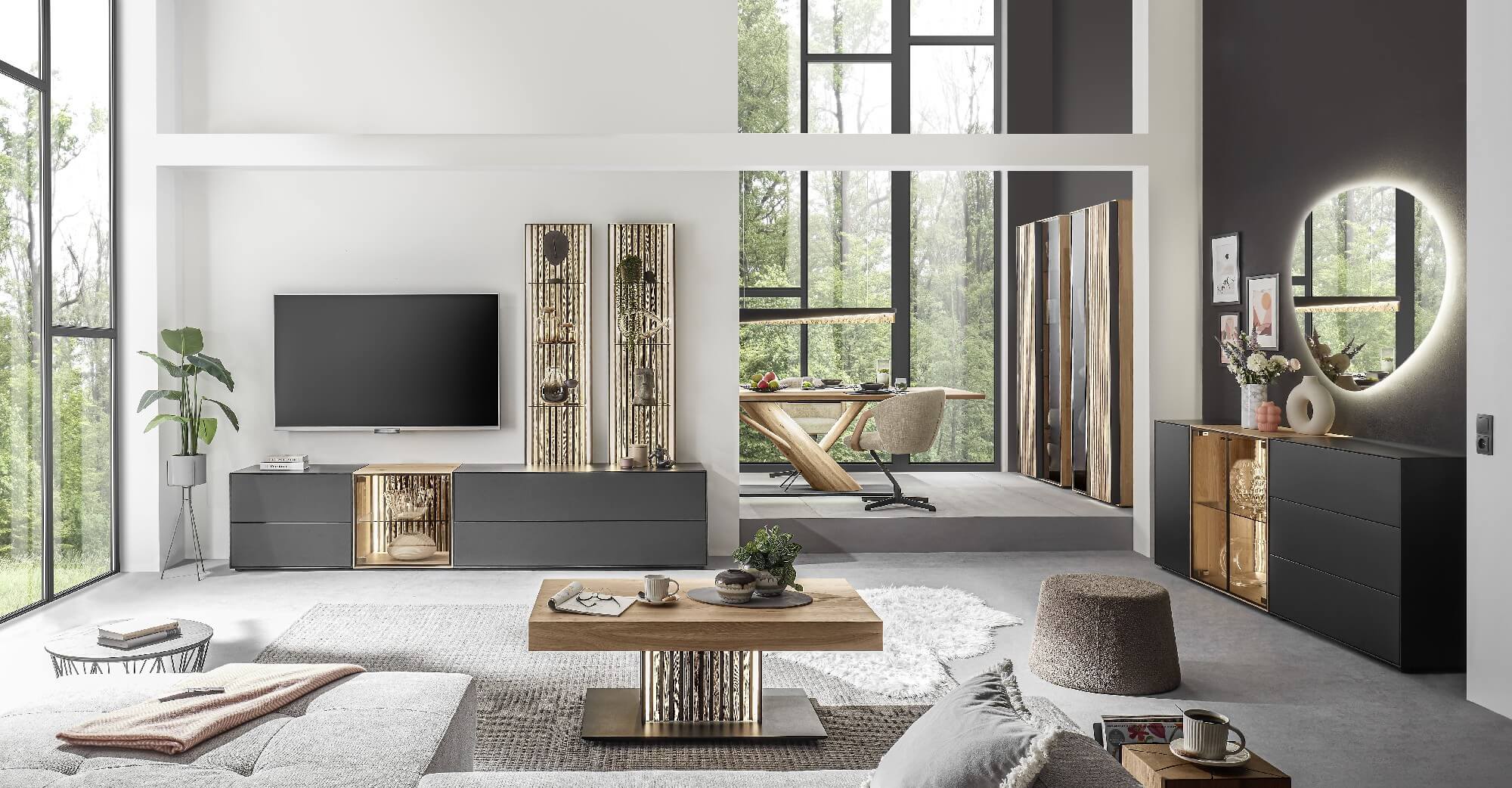 So wie Bäume und Moose im Wald sich gegenseitig brauchen, gehen Lack und Massivholz bei Selino eine perfekt aufeinander abgestimmte Symbiose ein. Die durch indirekte LED-Beleuchtung in Szene gesetzten Massivholz-Lamellen innerhalb der Möbel werden von anthrazitfarbenem Lackelementen umhüllt. Ein einzigartiges Zusammenspiel, das seinesgleichen sucht und man in Zukunft nur in Ihren vier Wänden findet.
